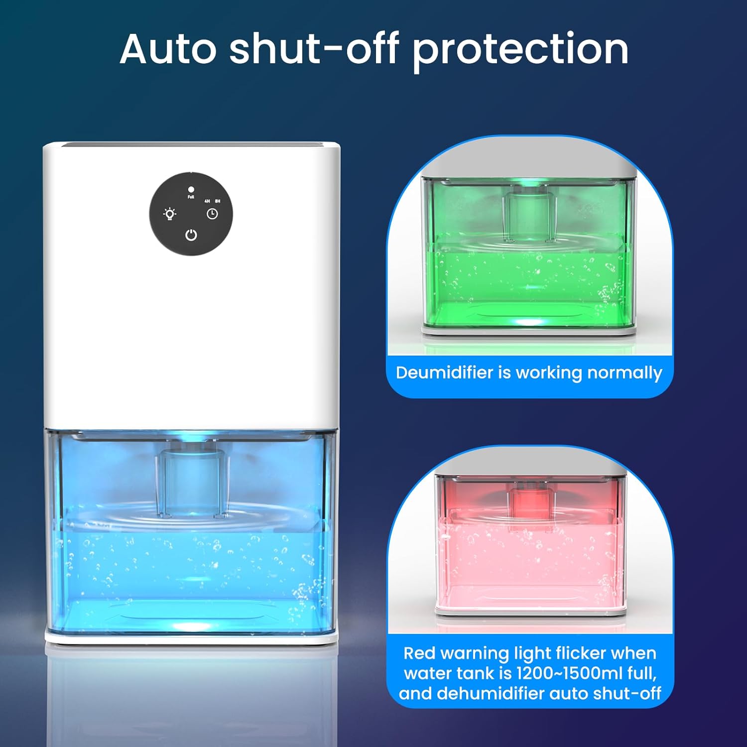 - Auto Shut Off Protection: When the water tank is 1300~1500ml full, dehumidifiers will auto shut off work, and the light will flash red to inform you. It is also very safe and convenient to use when you are not at home.