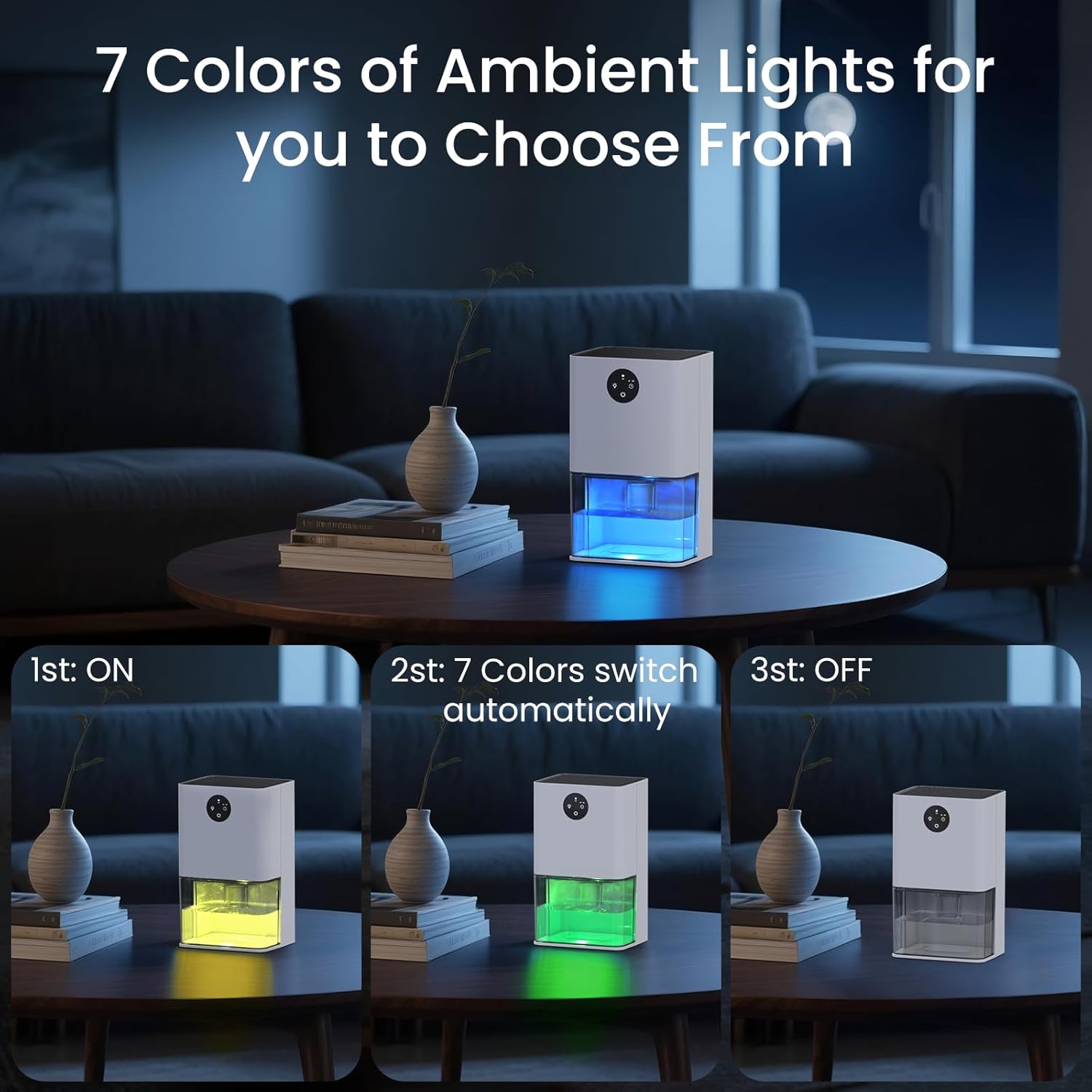 - Small Dehumidifiers with Colorful Light: There is a separate light button, which can emit 7-color romantic atmosphere lights for you, and the ultra-quiet operation (30dB) creates a comfortable and peaceful environment for your bedroom and office.