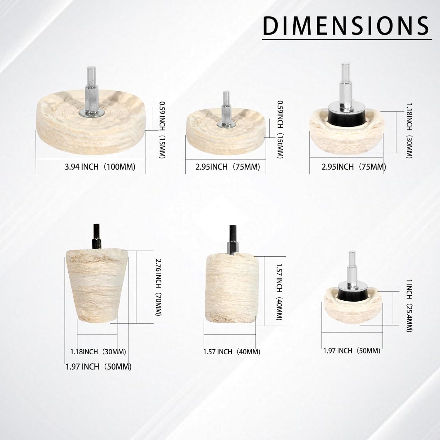 - 6 Sizes Available: Buffing pad polishing wheel kits available in 100mm/75mm T-shaped, 40mm cylindrical, 50mm conical, and 50mm/75mm mushroom shapes