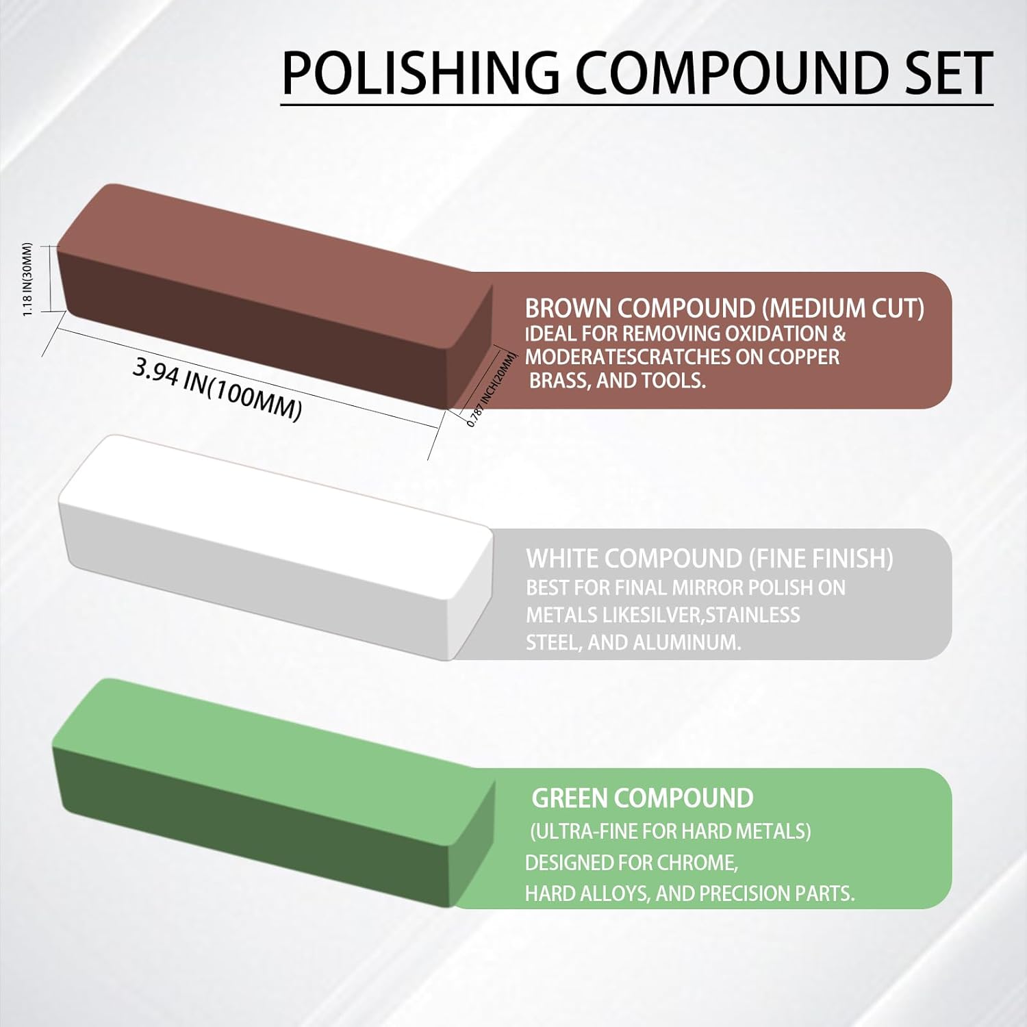 - 9 Pcs Versatile Polishing Set: Includes 6 durable polishing wheels (multiple sizes) and 3 polishing compounds (coarse/medium/fine) for versatile use.