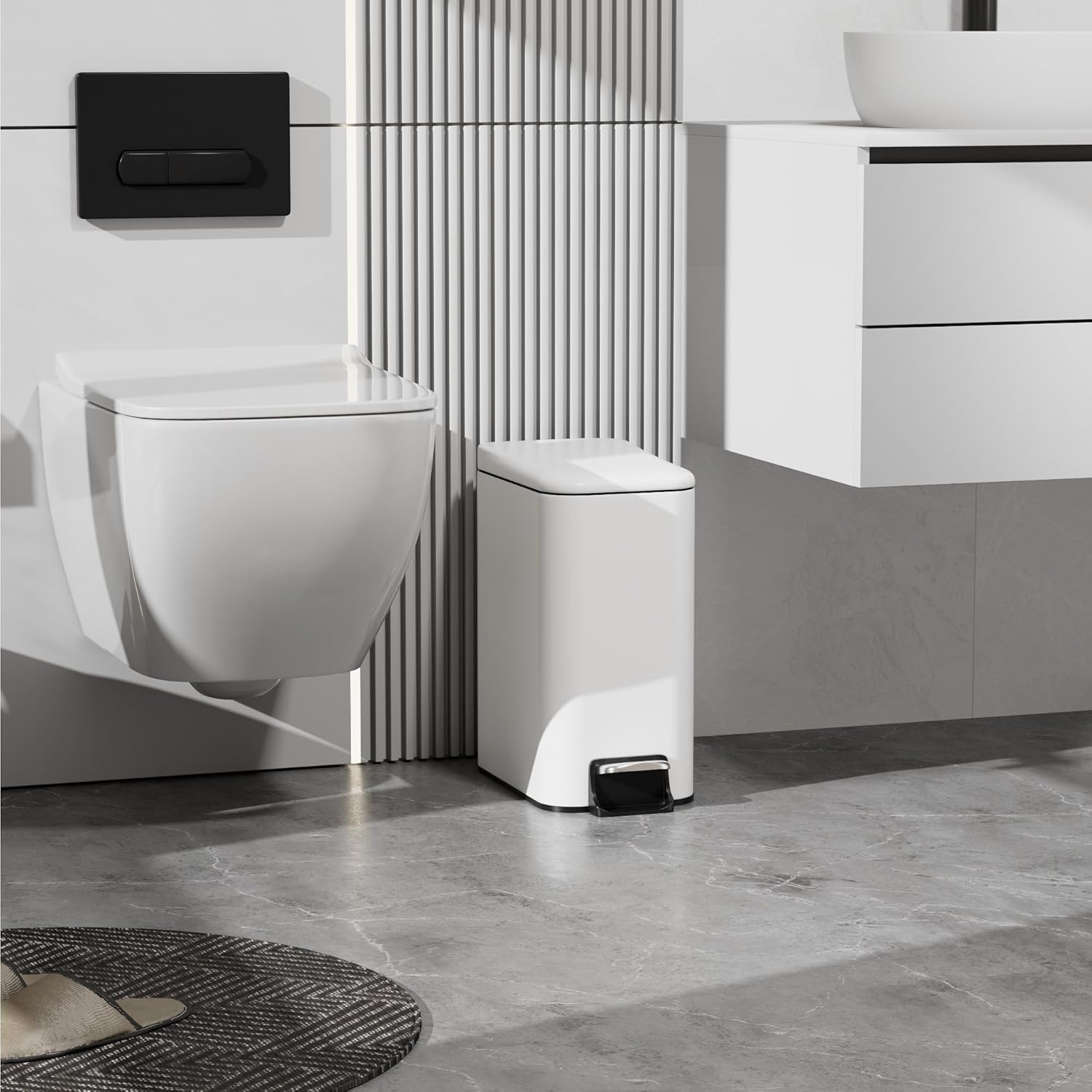 - Compact & Practical: This bathroom trash can with a lid measures just 5.5 inches wide, making it ideal for any corner of your home, office or bathroom. Besides, the bathroom trash can locks at a 90° angle for continuous disposal of multiple pieces of trash. With lid design keeps tidy contained even if knocked over