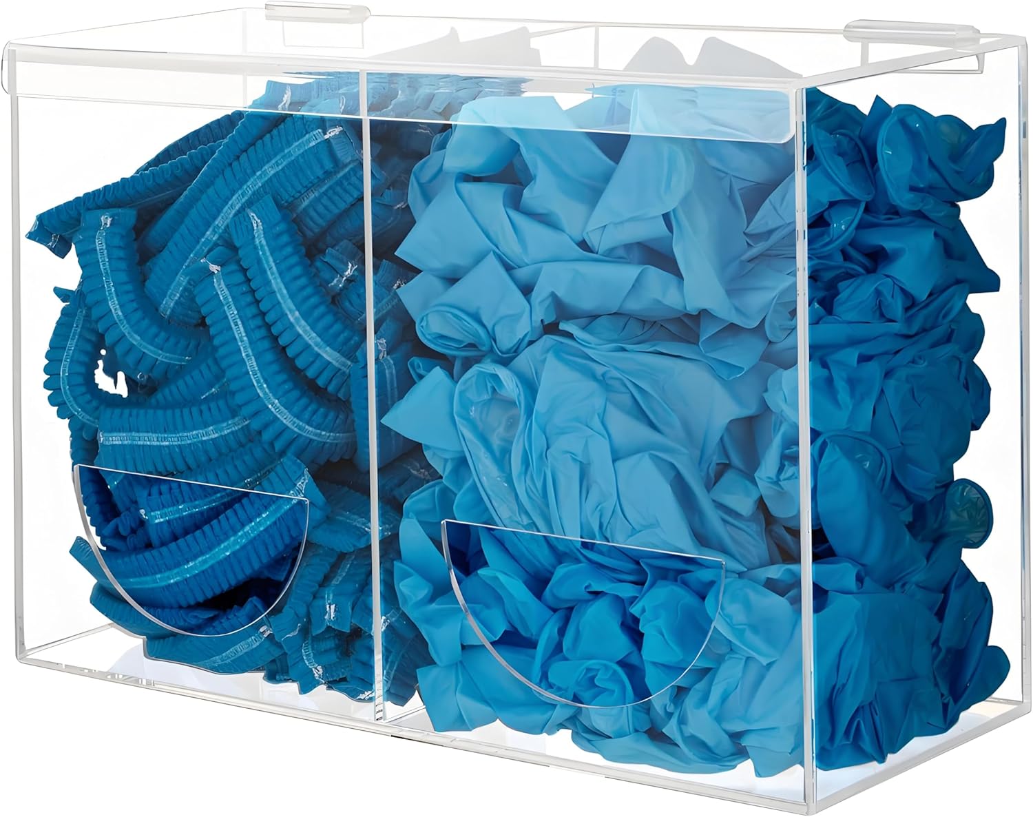 - Hygienic Organization Solution - The glove dispenser features 2 spacious clear acrylic compartments with large front openings for quick access. Ideal for gloves, hairnets, shoe covers, earplugs, or medical supplies. Transparent container ensure visibility and hygienic storage