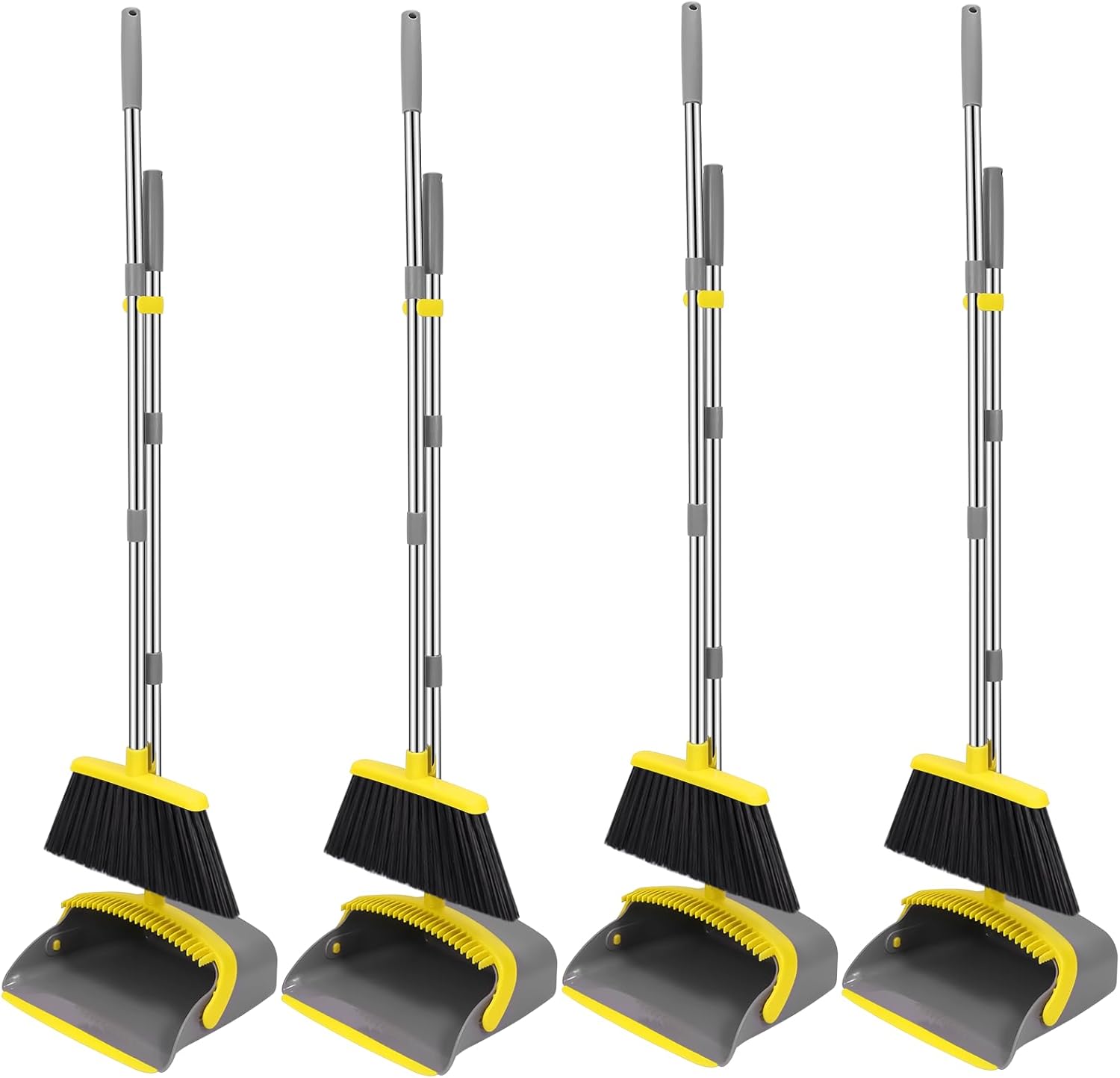 NACENA Broom and Dustpan Set, 52-in Long Adjustable Handle Broom Dustpan Combo with Dustpan Teeth to Automatically Clean Hair Suitable for Home Kitchen Office Hall Floor (Grey&Yellow), 4 Pack