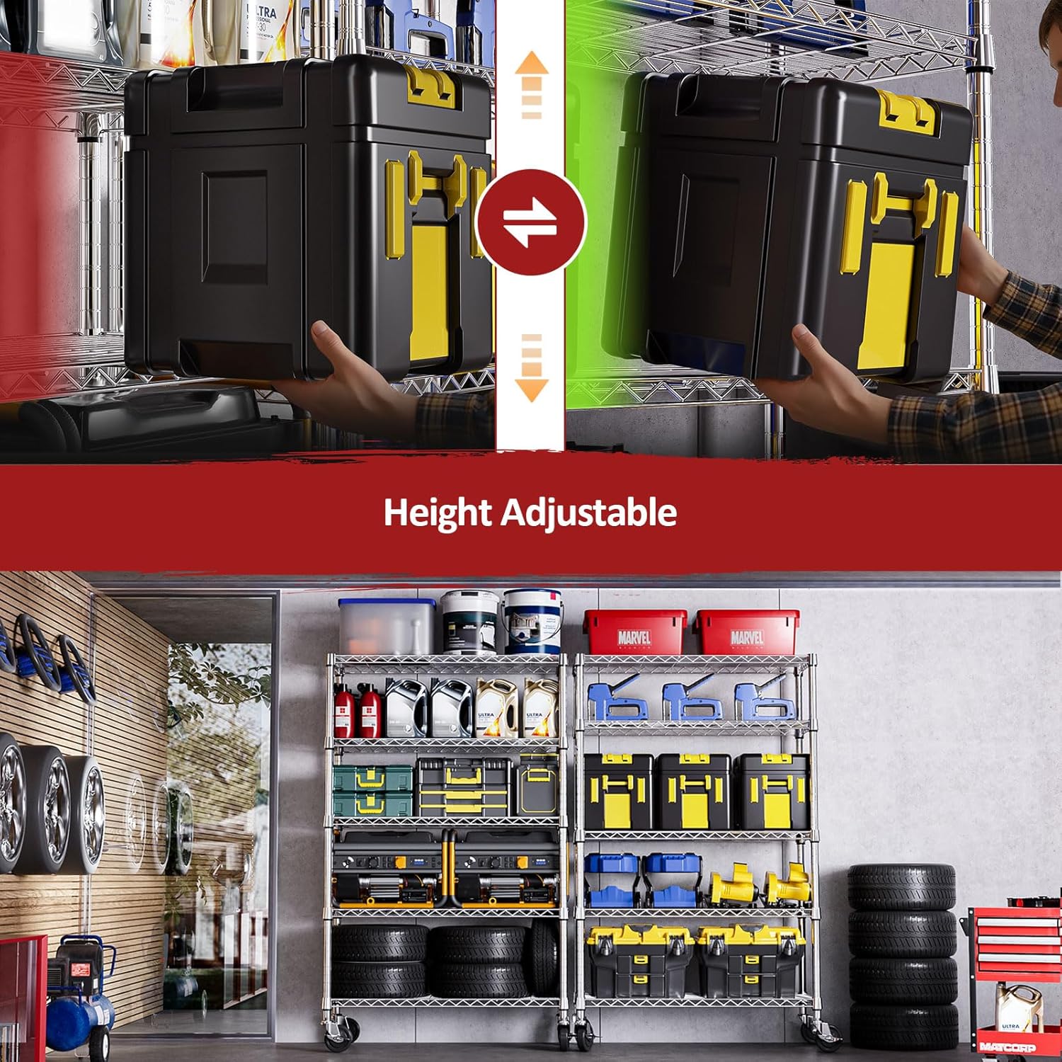 - 【Adjustable Shelves & 360° Lockable Wheels】Customize the height of each shelf in 1-inch increments to fit everything from large appliances to small bins. Equipped with 4 smooth-rolling 360° caster wheels (2 with locks), this unit offers maximum mobility and stability—effortlessly move it around your home, garage, or office, and lock it in place when needed.