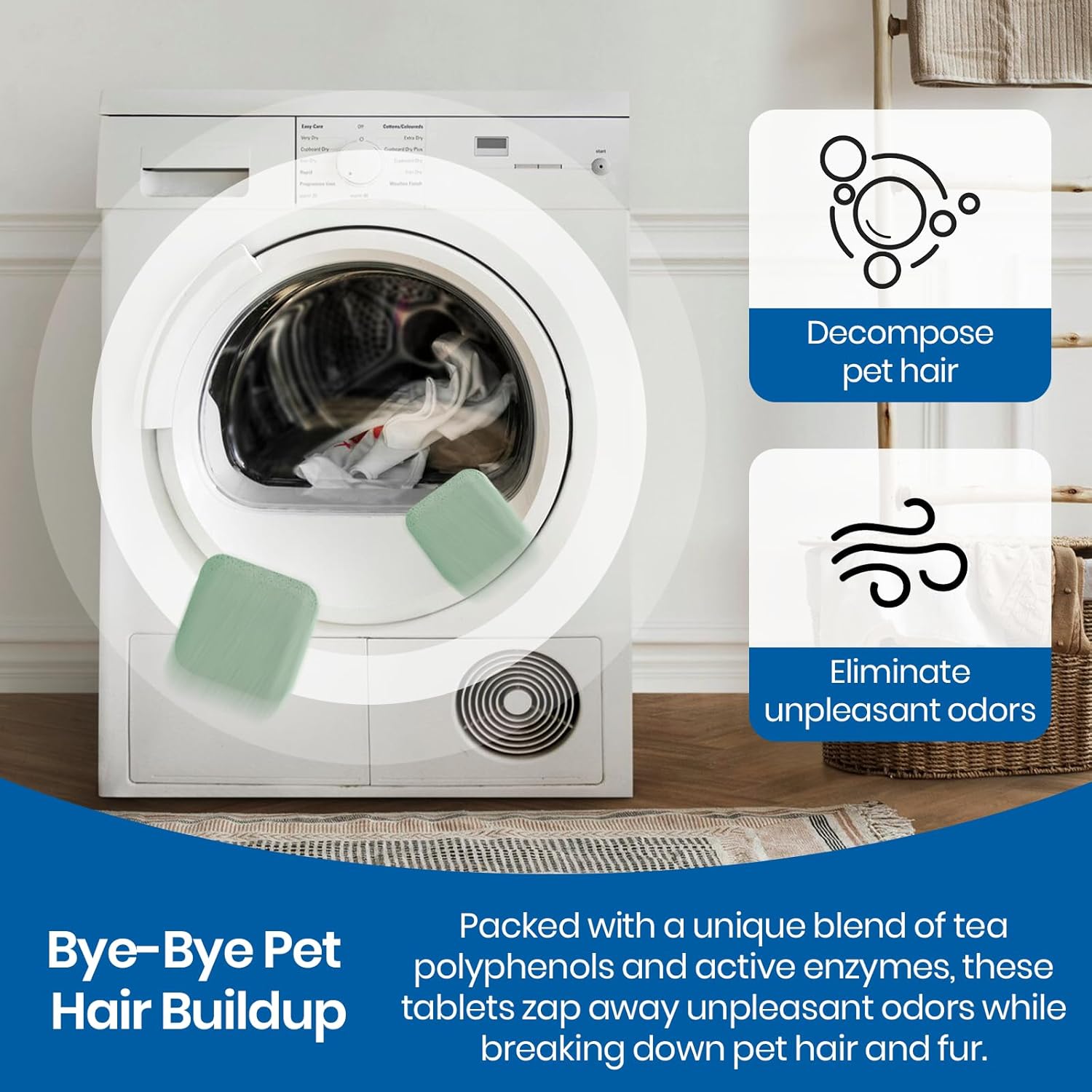 - Bye-Bye Pet Hair Buildup: Packed with a unique blend of tea polyphenols and active enzymes, these tablets zap away unpleasant odors while breaking down pet hair and fur. Keep your machine running smoothly without the hassle of clogs