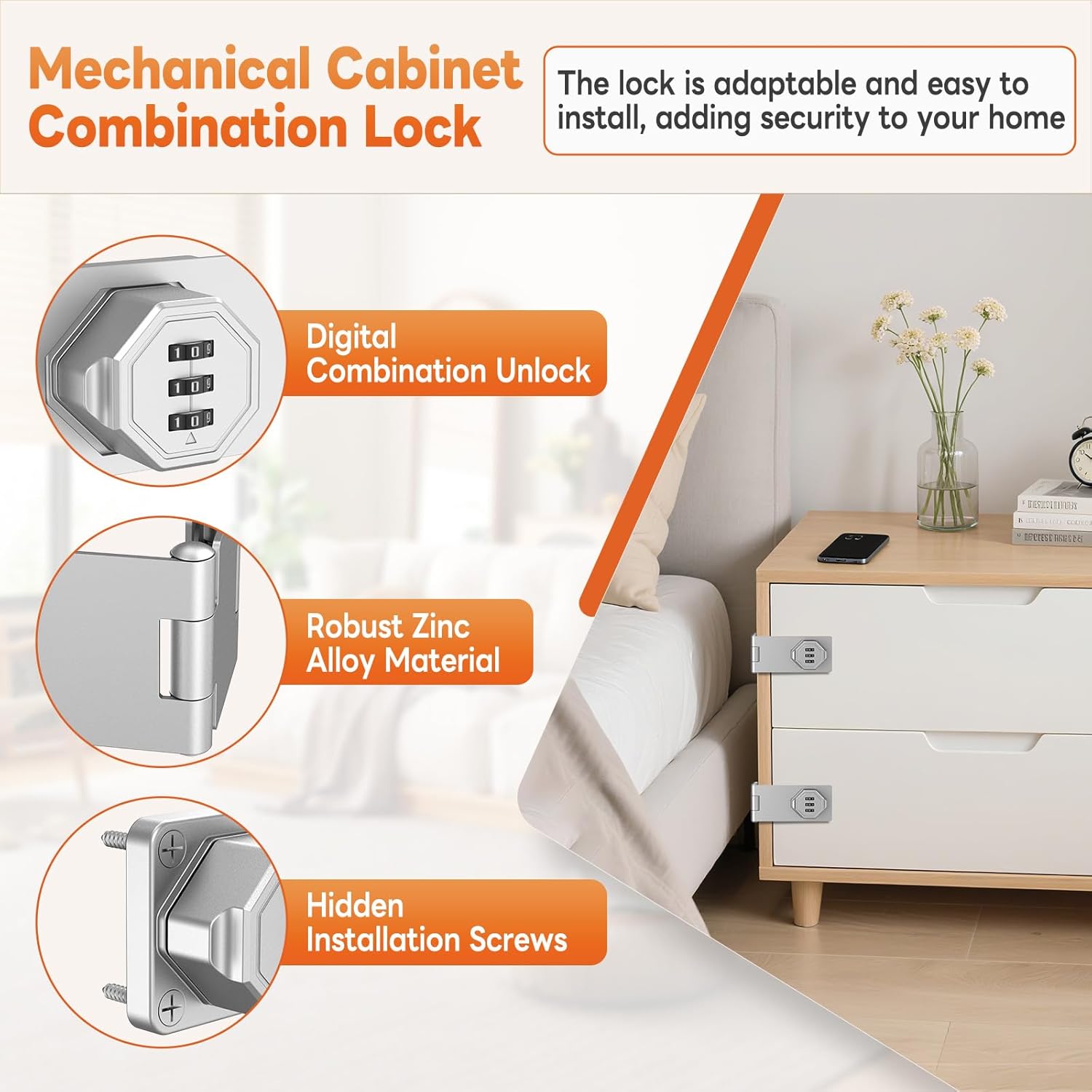 - Hidden Screw Installation: Mechanical combination lock adopts hidden screw hole design, only need to use screws to fix the lock body, buckle cover to hide the installation holes, not only solid anti-prying, but also to keep the cabinet aesthetic
