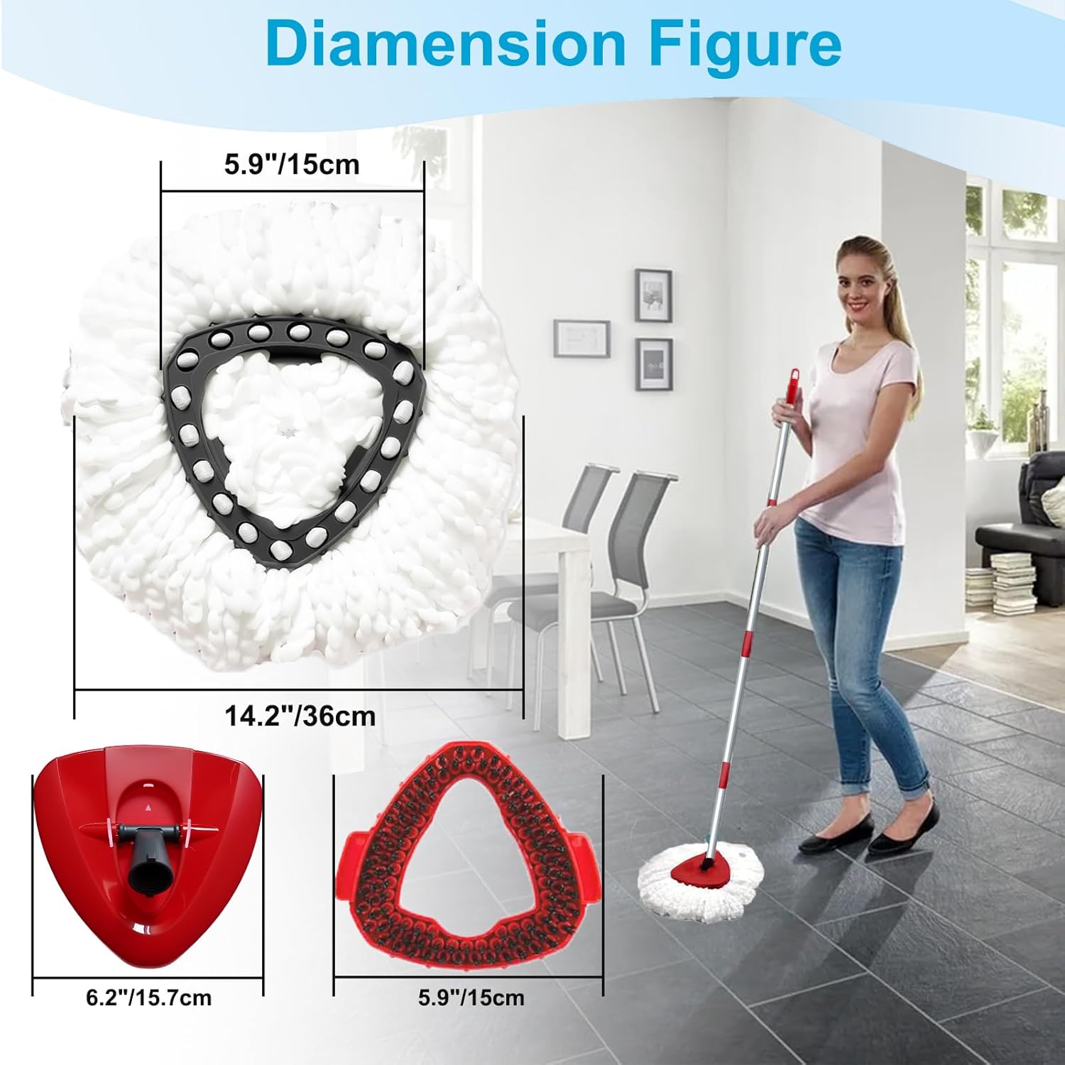- 【Easy to Install】: Replacement Head/Brush and Base snap together, very solid; just remove the dirty mop head and snap the new spin mop refill into the triangular mop base, after you hear a "click", it means the replacement is successful