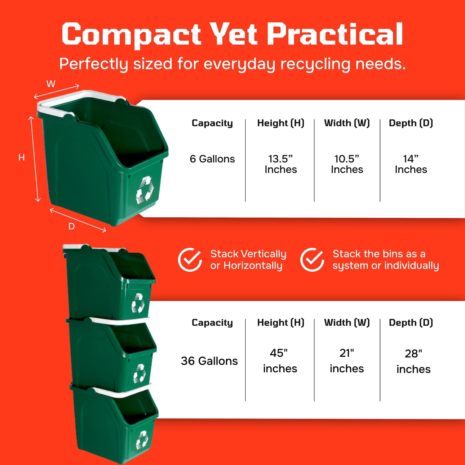 - STURDY AND STACKABLE: These stacking recycling bins are made to maximize efficiency, allowing you to create a 3 bin recycling center or combine multiple units as needed. They’re designed to stay securely stacked without slipping or wobbling.