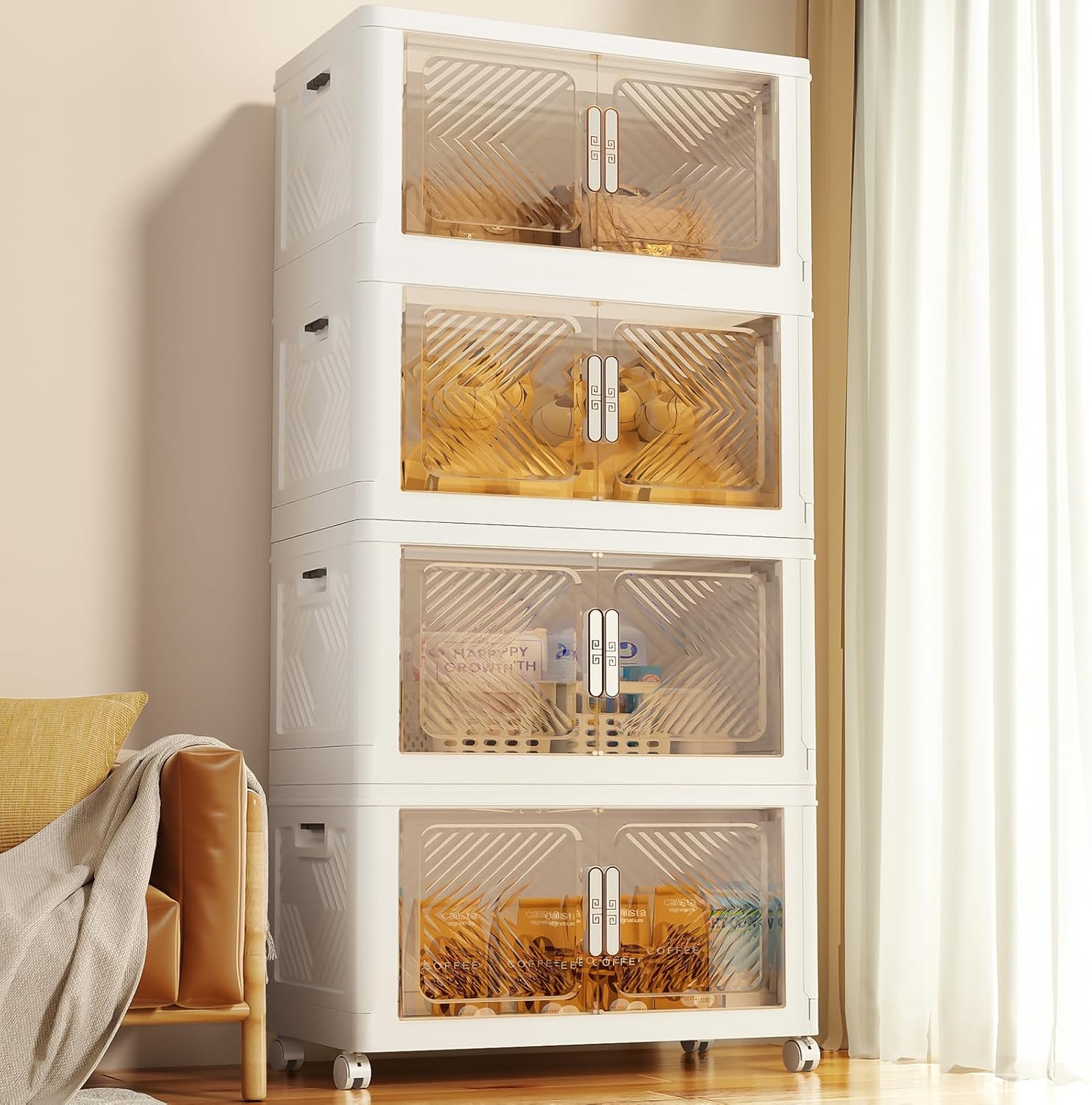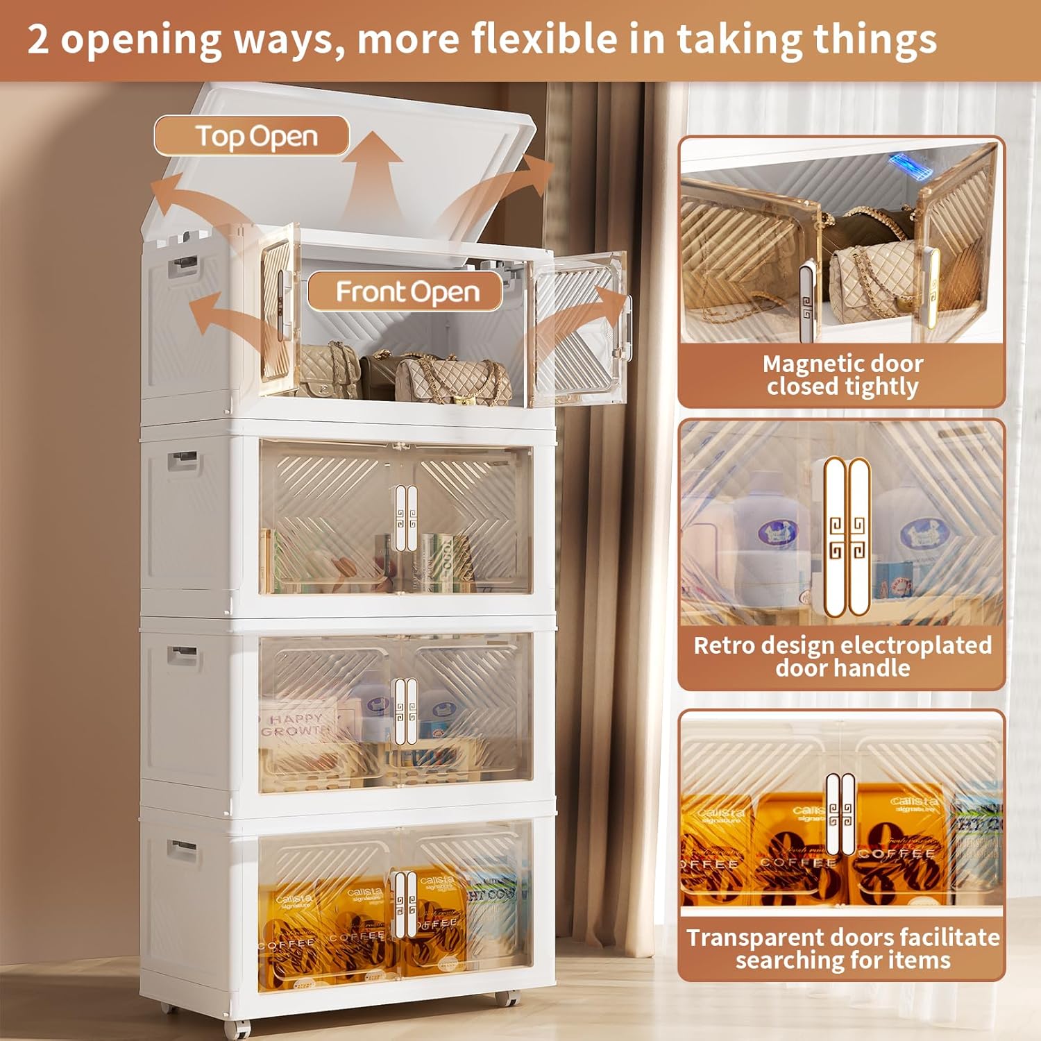 - 【Double Door & Visual Design】The storage boxes can be opened from the front doors and the top lid, 2 opening ways are convenient for retrieving items from different directions. The top lid makes it easy to quickly access large items, such as clothes and blankets. Powerful magnets are built into the front door to ensure that it will not automatically open. The door is made of transparent material, making the clear storage bins visible, so you can quickly find the items you need and save your time