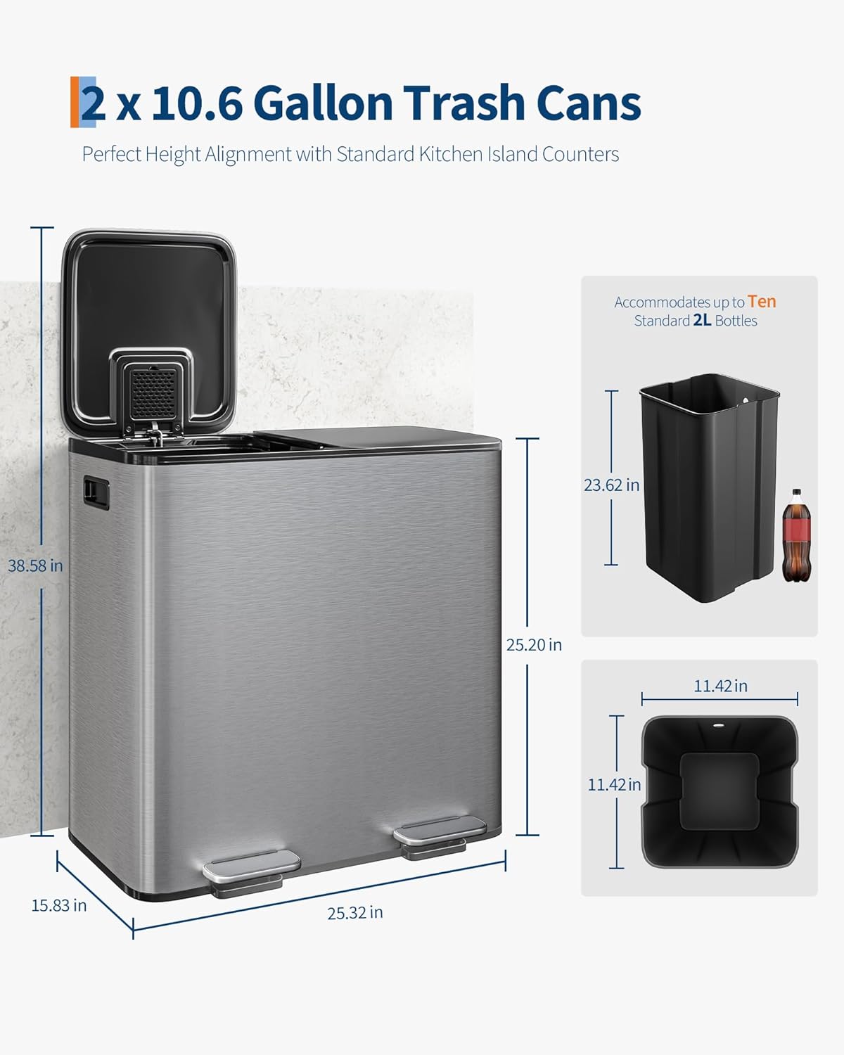 - [SLEEK AESTHETIC, COMPACT FOOTPRINT] – GarveeHome large double kitchen trash cans delivers a refined profile at 25.32 in L × 15.83 in W × 25.20 in H when closed, extending to 38.58 in H at full lid opening—just 2.58 in above a standard 36 in island countertop for perfect alignment. Each removable inner basket (11.42 in W × 11.42 in D × 23.62 in H) accommodates up to 24 standard 16.9 oz water bottles or 48 12 oz cans, maximizing sorting capacity without encroaching on your floor space