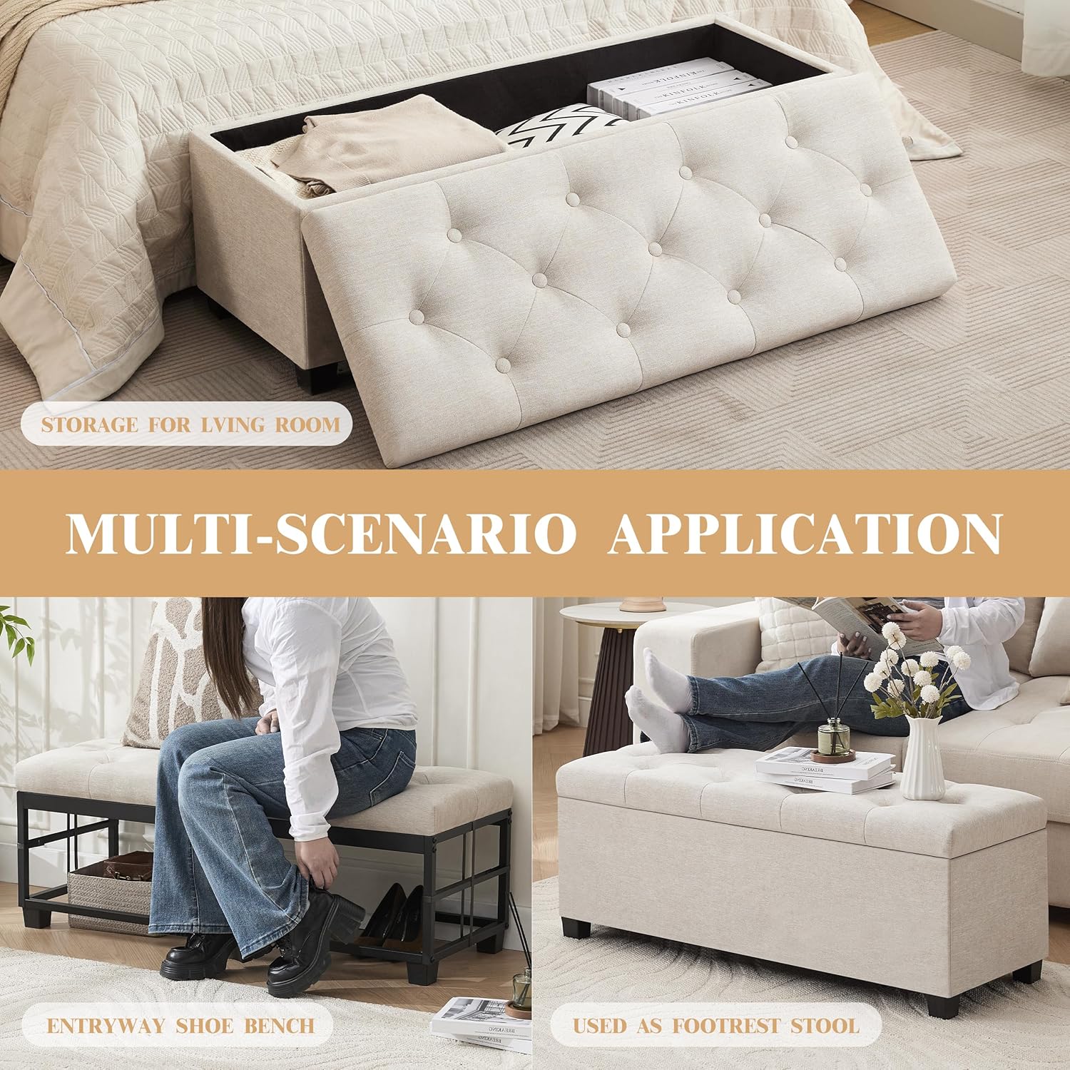 - Versatile for Multiple Spaces: Featuring a minimalist linen design, this storage bench blends effortlessly with various home styles. Perfect for entryways, living rooms, bedrooms, it functions as a shoe bench, footrest, end of bed bench, or window bench.
