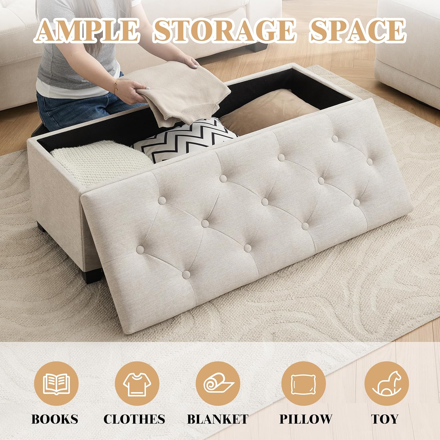 43’’ Storage Ottoman Bench, Linen Entryway Benches Load up to 660 Lb, Modern End of Bed Benches for Bedroom, Ottoman with Storage Bench for Living Room, Beige
