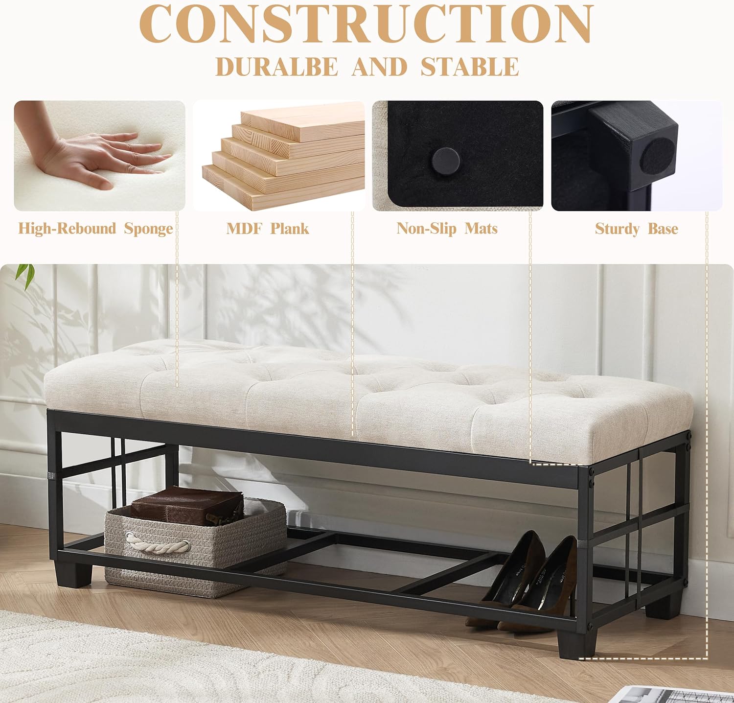- Comfortable Seating Experience: The materia of the end of bed ottoman bench is soft and breathable, the cushion of the bed bench is filled with 4.9-inch high-resilience foam, offers a soft yet supportive seating experience for lasting comfort.