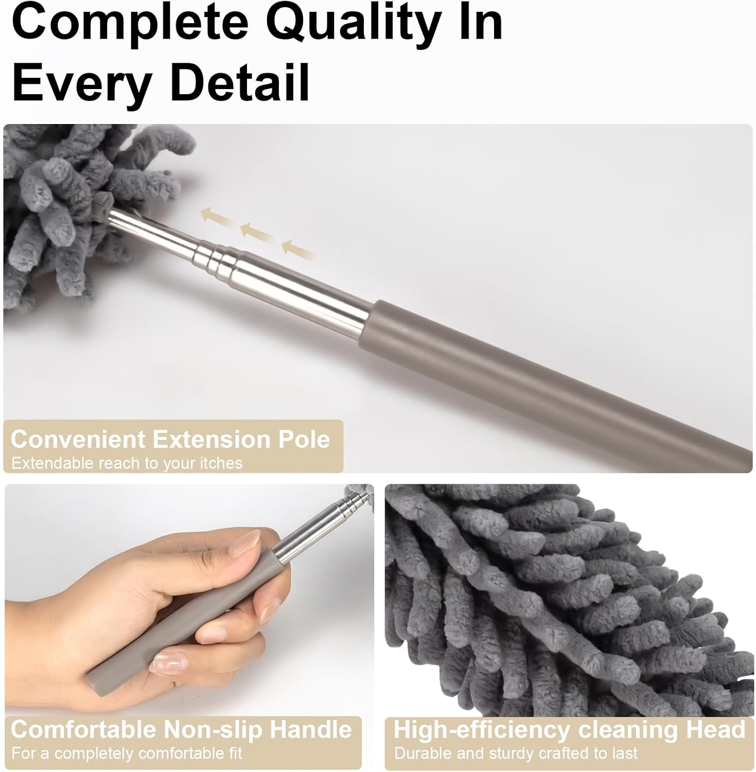 - 【Telescopic Handle】:With an extendable pole that reaches up to 30 inches, this duster effortlessly cleans corners at various heights. When folded, it's compact and easy to store, making it a convenient cleaning tool for any space.