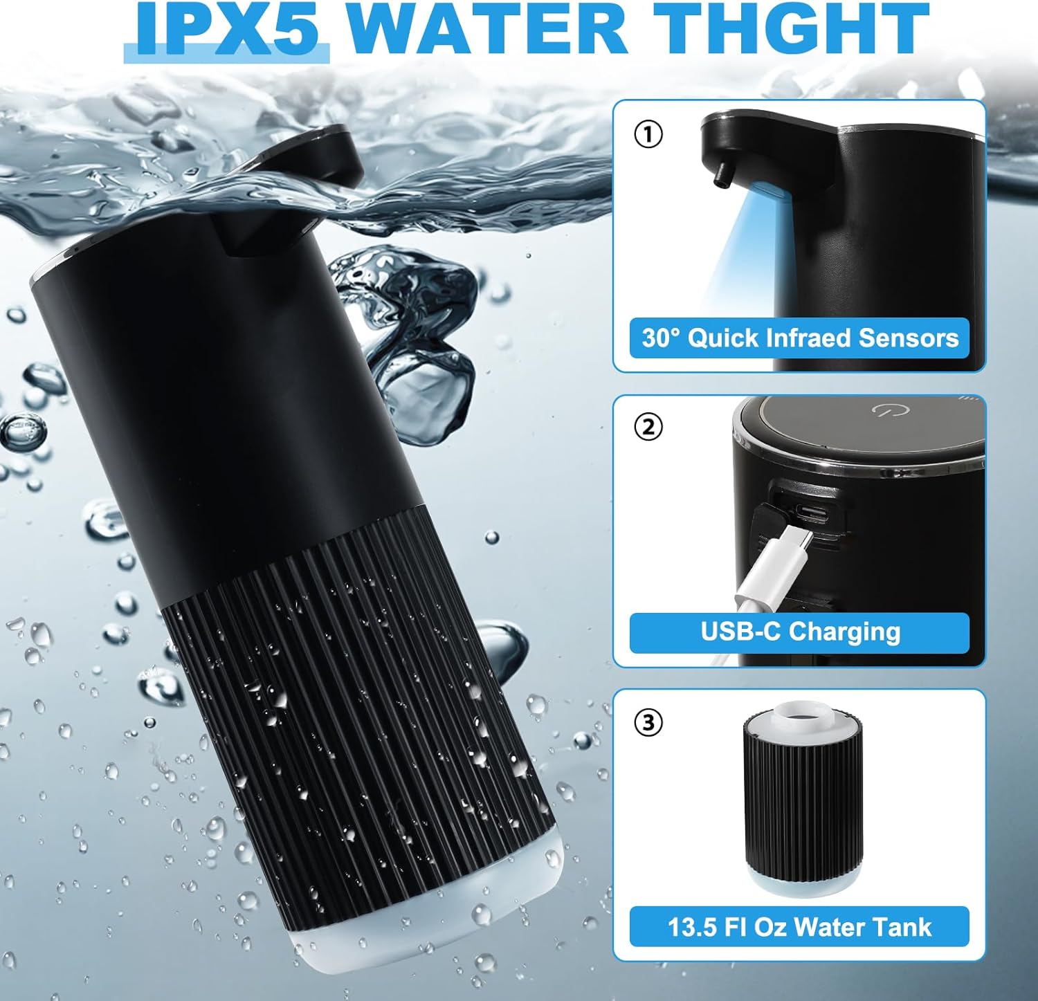 - 【IPX5 WATERTIGHT & EXTENDED BATTERY LIFE】Engineered with IPX5-rated watertight, this auto soap dispenser touchless withstands splashes in damp environments like sinks or showers. A secure rubber seal safeguards the charging port in humid conditions. The integrated 1200mAh battery supports up to 60 days of daily use on a single USB-C charge—no frequent recharging needed. (Misunderstanding due to differences in usage frequency)