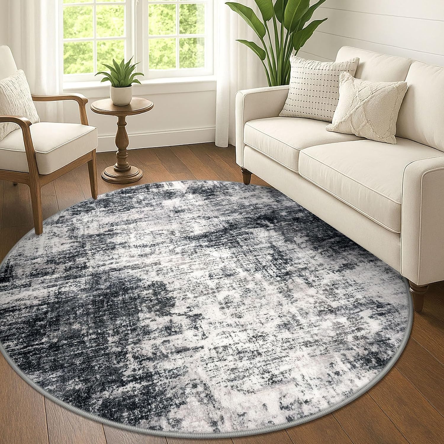 IOHOUZE Abstract Round Area Rug 6 Ft Washable Circle Rugs Large Round Rug Non Slip Thin Soft Circle Rugs, Printed Faux Wool Floor Carpet for Bedroom Living Room Dining Room Nursery, Black Grey