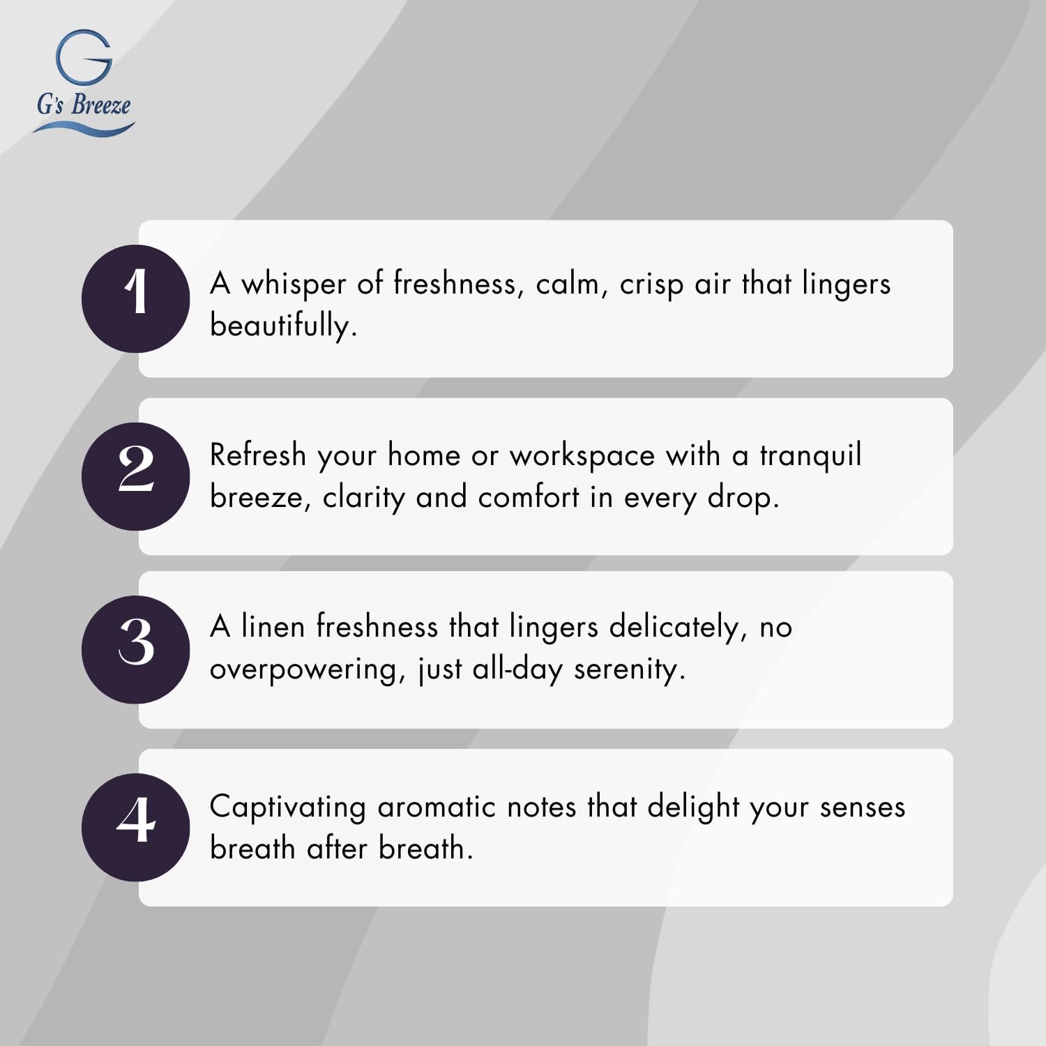 G's Breeze Linen Diffuser Oil Refill - Crisp, Clean Fragrance with Cotton & Floral Notes - Inviting & Fresh Scent for Any Space – Ideal for Home & Office – Long-Lasting Freshness Aroma - 60 ML