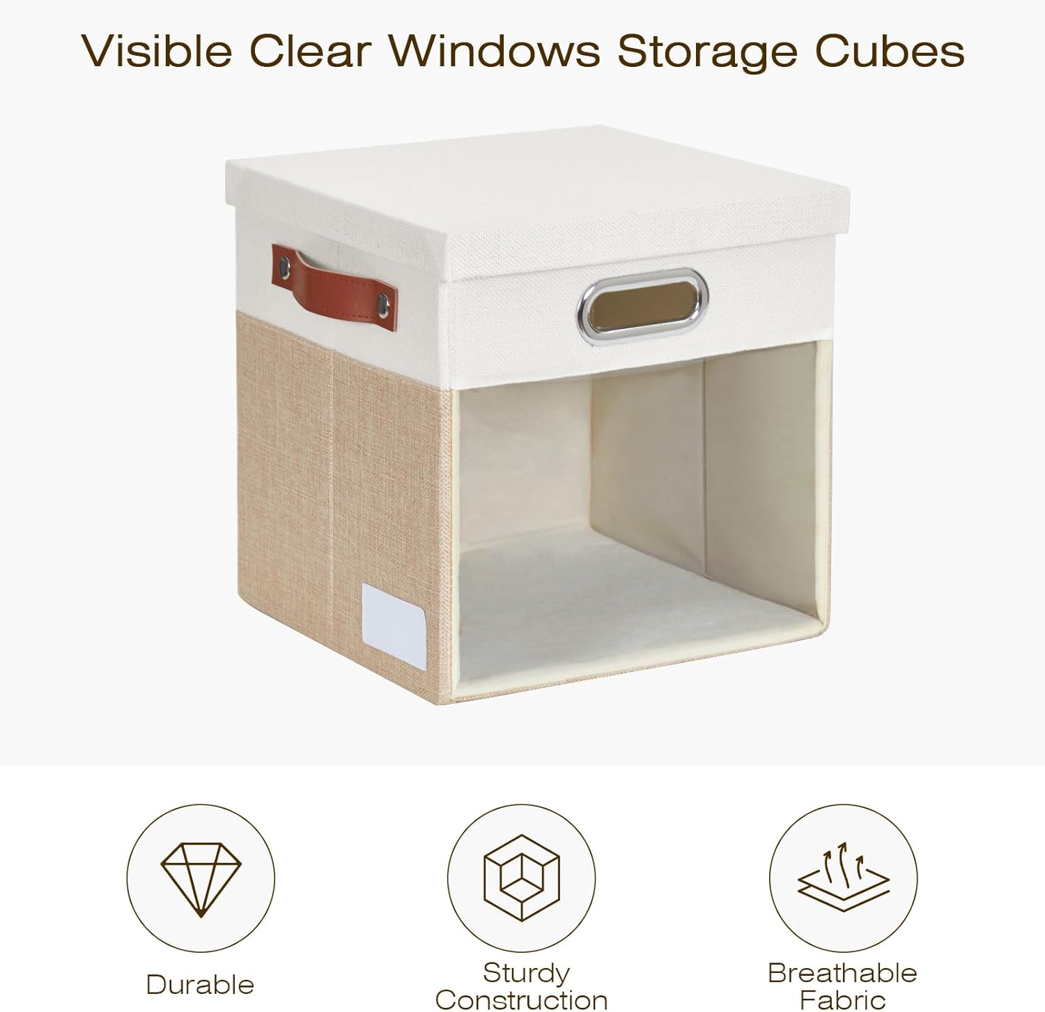 Fabric Storage Cubes with Clear Windows and Lids 11'' Foldable Storage Bins with 3 Handles, Decorative Storage Boxes for Home, Bedroom, Closet, Office (Beige & White)