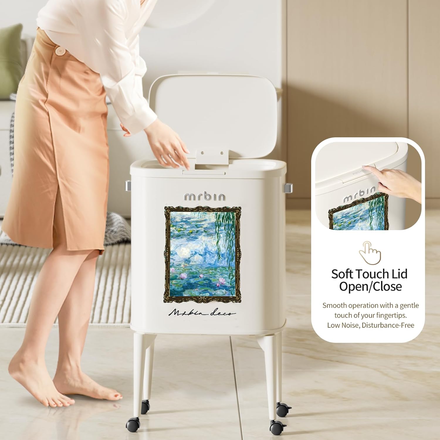MRBIN Metal Kitchen Trash Can with Wheel Legs, 36L / 9.5gal Medium Press Lid Slim Removable Waste Basket, Pet Proof Tall Narrow Garbage Pail for Vanity, Bedroom, Bathroom, Living Room, Water Lily