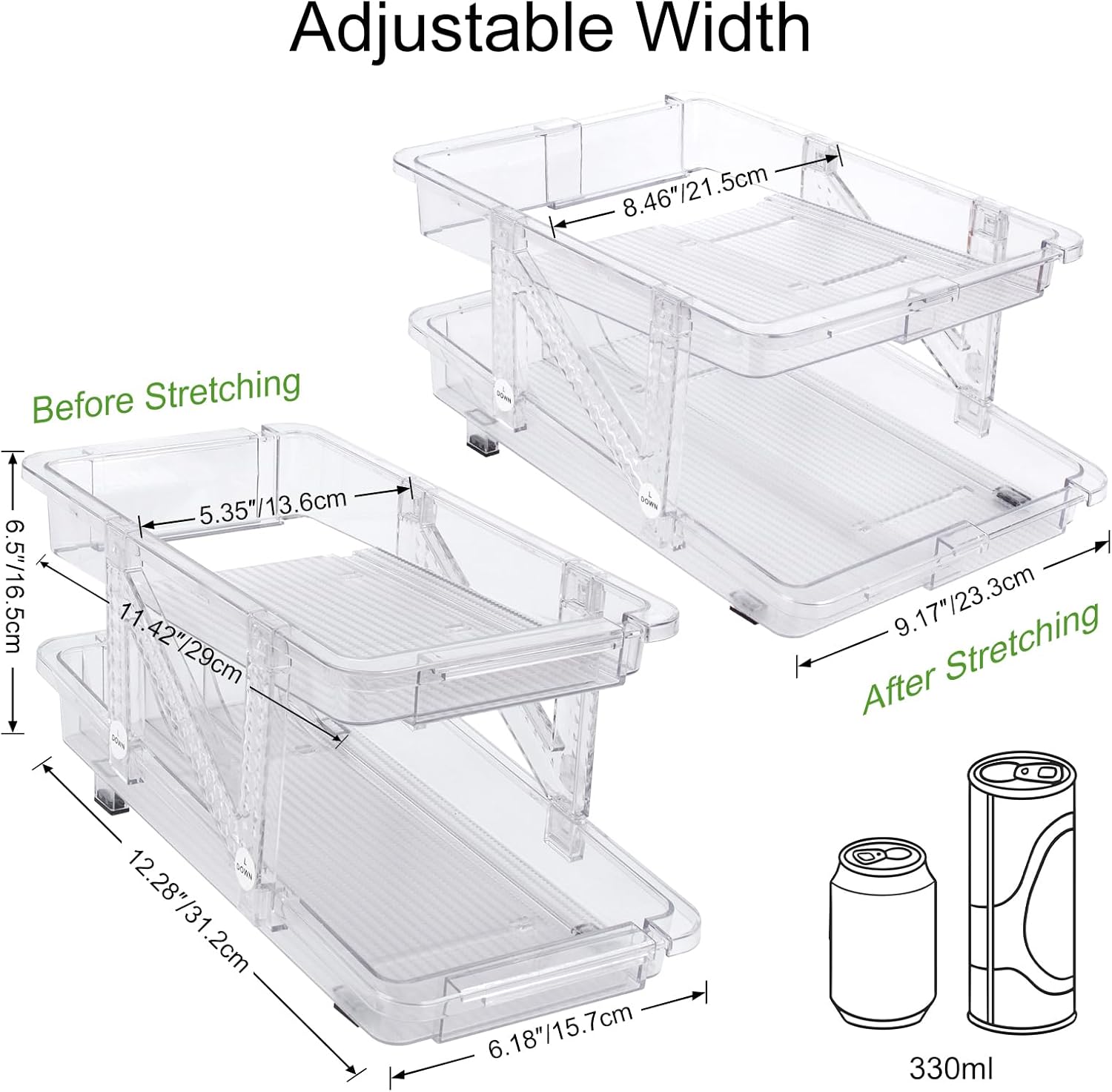 - Unique Adjustable Design: Our double-layer beverage organizer features a cleverly designed adjustable width, allowing you to customize the space to fit bottles, cans, or cups of varying heights. It’s perfect for organizing your drinks in style and efficiency.