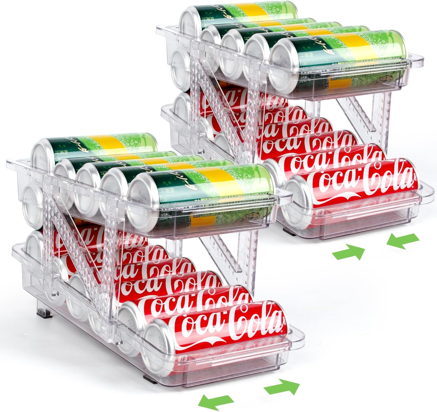 2 Pack Drink Organizer for Refrigerator, Soda Can Dispenser, Adjustable Width Canned Food Pop Cans Container Beverage Holder for Fridge Organizing, Clear Plastic Storage Bins