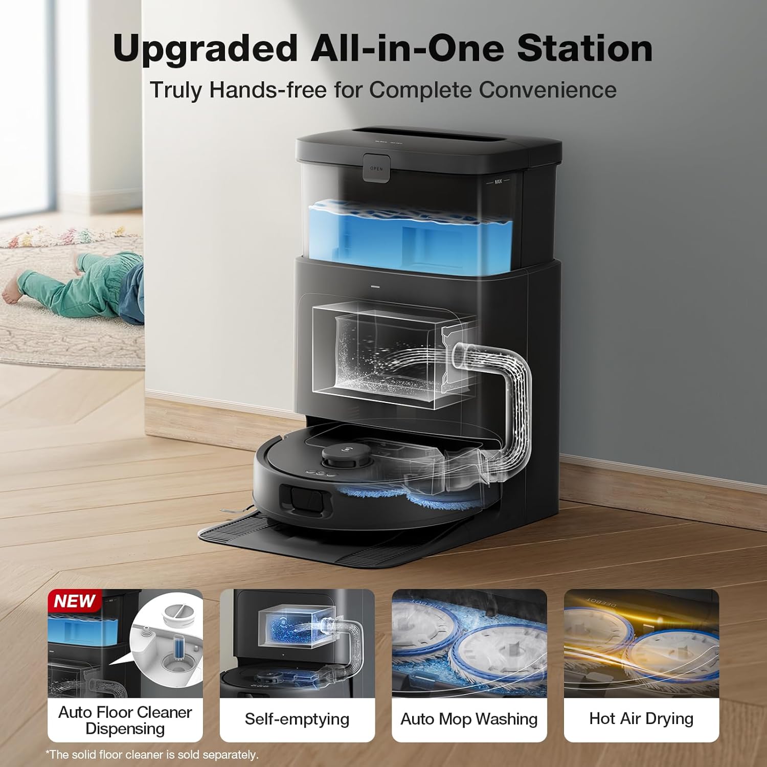 - All-in-One OMNI Station - The DEEBOT N30 OMNI Station supports automatic mop washing and self-emptying, designed to liberate your hands. A post-cleaning 104℉ hot air drying function prevents odors, ensuring your home always smells fresh.The 2.6L dust bag can hold up to 75 days' worth of dust, eliminating the need for frequent emptying.