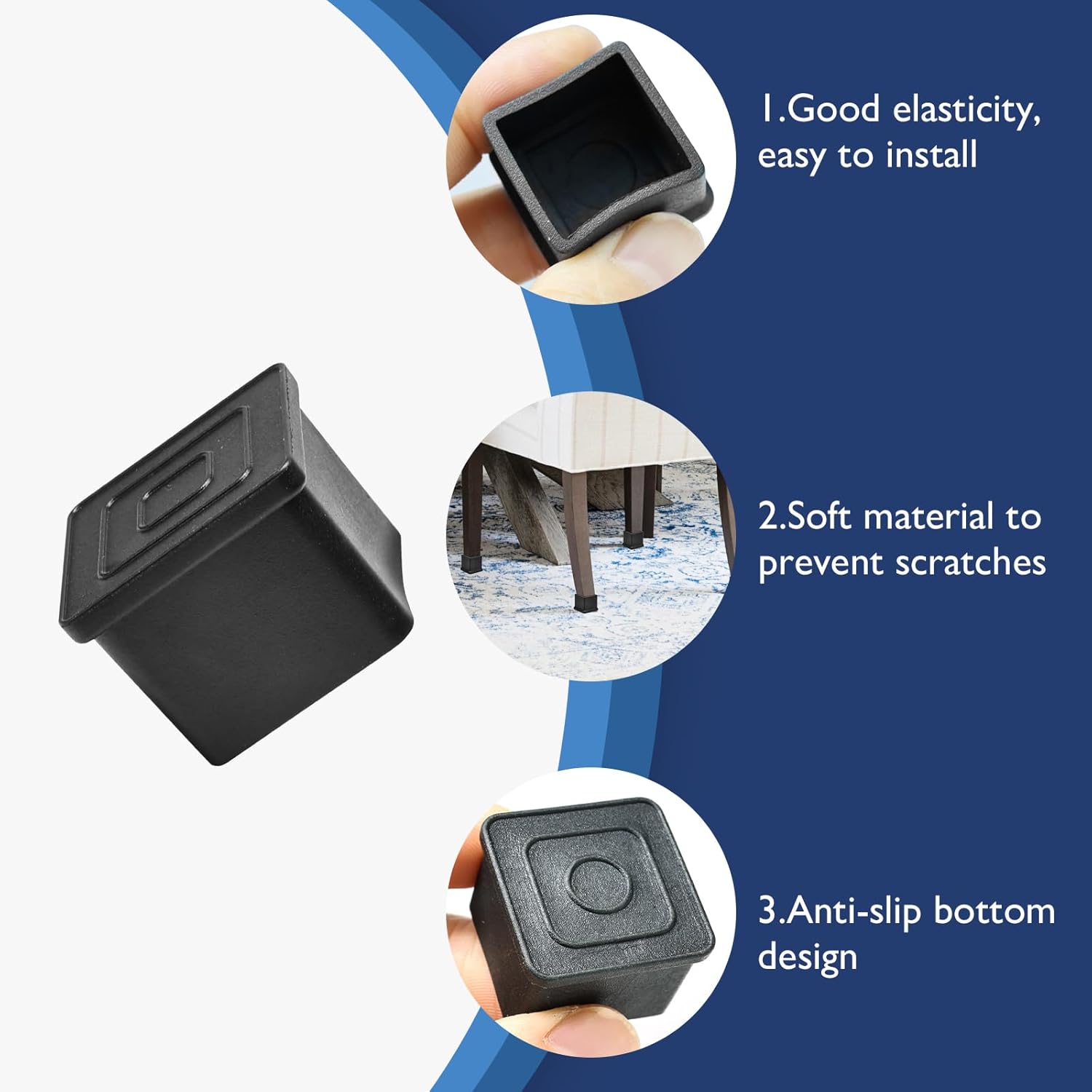 - Wide Applications: Suitable for various size furniture feet, our chair feet caps can be used on kitchen chairs, tables, dining room chairs, sofas, couches, bar stools, beds, dressers, patio chairs, metal bistro chairs, desk chairs, any square opening; They provide a neat and safe finish to tube ends
