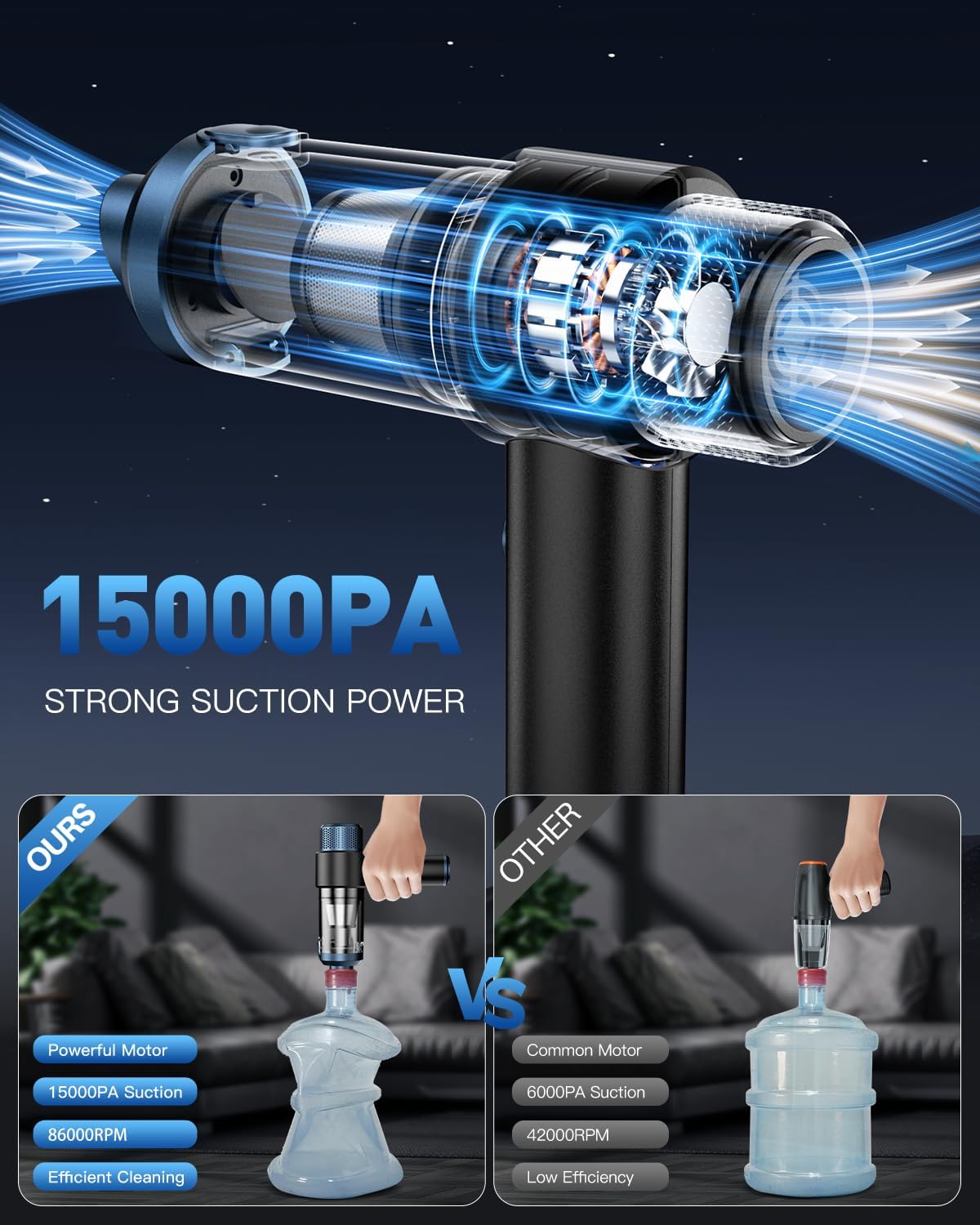 - 🌀【Powerful 15000PA Suction】Powerful motor of the hand held vacuum cleaner has 86,000RPM and provides up to 15000PA of suction power. Whether it's a sofa or carpet in your home, or the interior of your car, it's easy to clean. The rapid heat dissipation function can expel heat in a short period, making the motor more durable and long-lasting. The operating sound is as low as 40dB, so you can clean quietly without disturbing others