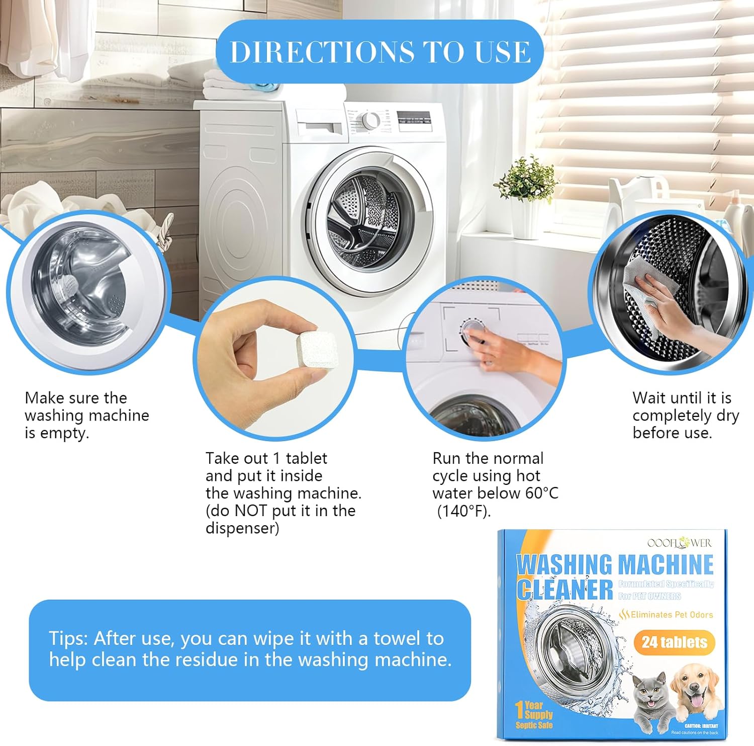 Washing Machine Cleaner Tablets 24 Pack, Formulated for Pet Owners, Deodorizer, Work with Top & Front Load, HE, Deep Cleaning Descaler, Removes Residue and Odors, Septic Safe