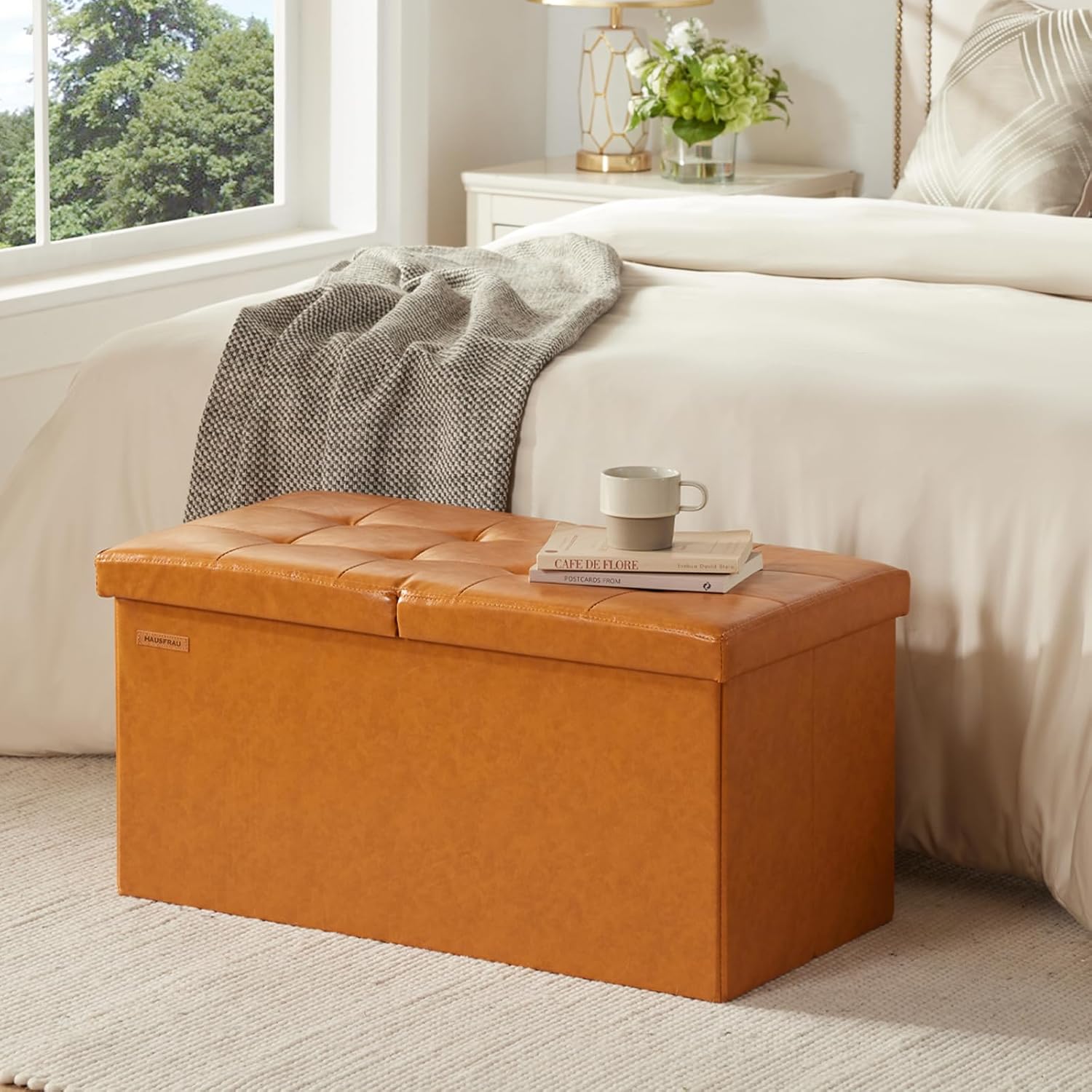 HAUSFRAU - 30 Inches Storage Ottoman Bench with Flipping Lid, Foldable Storage Chest Foot Rest for Living Room, Bedroom, Entryway, Load 660 lb, Synthetic Leather, Cognac Brown