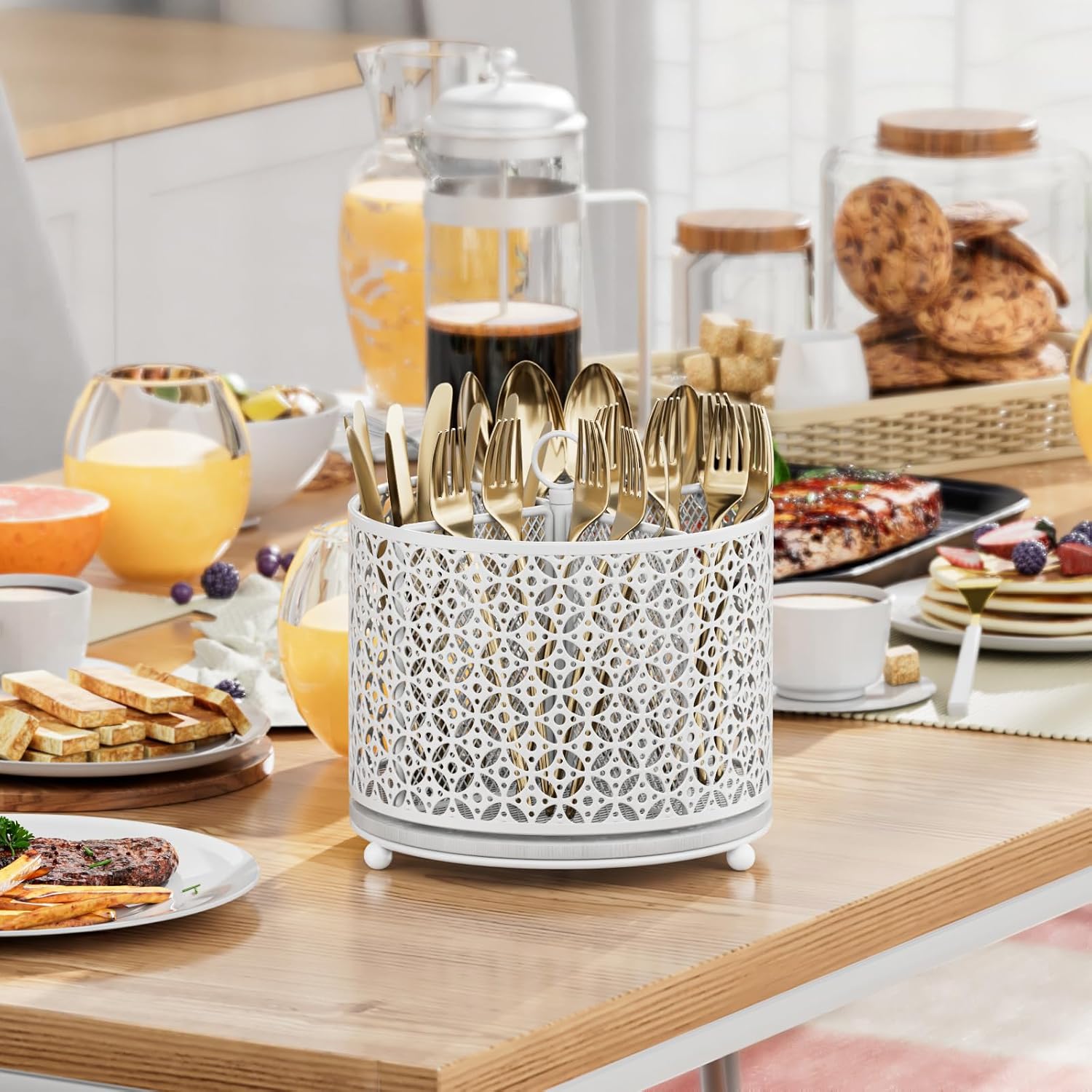- 360°Rotating Silverware Organizer: This kitchen counter organizer offers a rotating design that makes your utensils easy to access .The rotation is smooth and effortless, adding a touch of modern functionality to your kitchen. Space-saving holder can perfectly organize your knife, forks, spoons etc. No more digging through the drawers or laying messy on the table. Just a simple spin to get what you need. Perfect utensils container for RVs, small kitchen
