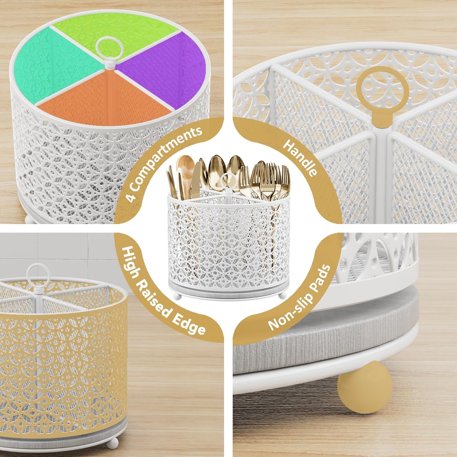 - Durable & Non-slip Counter Organizer: The cutlery holder is made of high-quality anti-rust and waterproof metal, sturdy and built to last.It is equipped with large base and 3 anti-slip rubber pieces to makes this spinning organizer more steady, firm and prevent scratching the kitchen counter surface or dining table. Handle ring on the top make it convenient to take it from one place to another