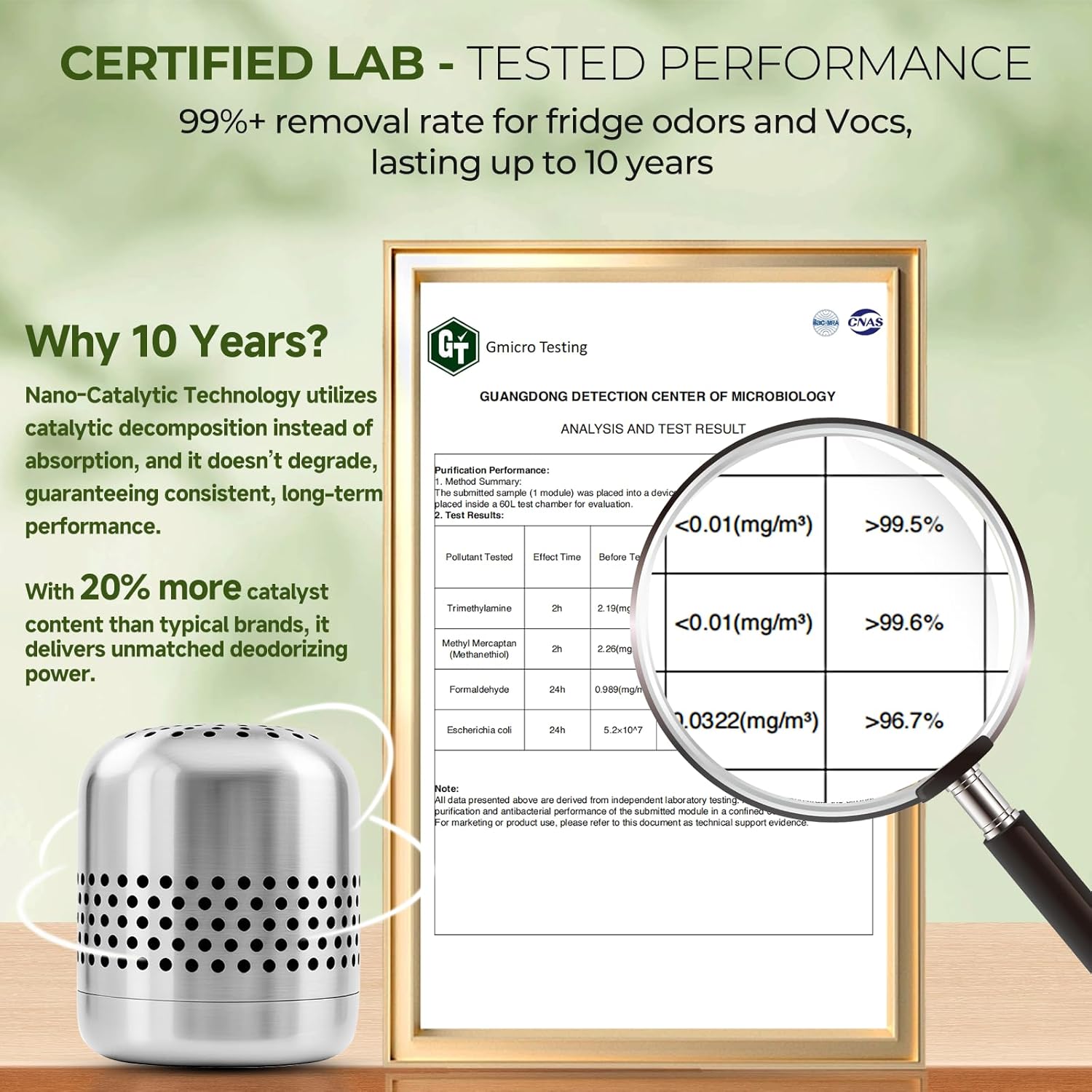 - 𝐔𝐩𝐠𝐫𝐚𝐝𝐞𝐝 𝐍𝐚𝐧𝐨 𝐂𝐚𝐭𝐚𝐥𝐲𝐭𝐢𝐜 𝐓𝐞𝐜𝐡𝐧𝐨𝐥𝐨𝐠𝐲 - No more lingering fridge odors. Powered by an advanced nano-catalyst, our fridge deodorizer actively breaks down harmful VOCs and neutralizes odor molecules at the source—eliminating smells instead of just absorbing them.