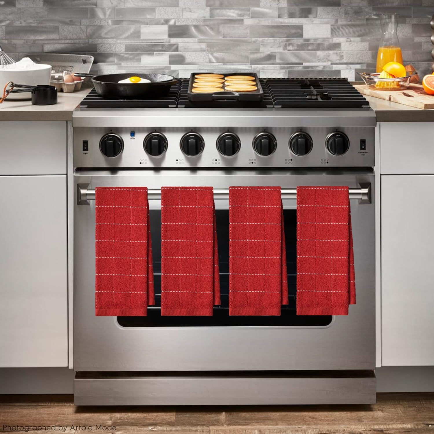 Artoid Mode Checkered Designed Cotton Red Terry Kitchen Dish Towels, 15x25 Inch Soft Absorbent Quick Drying Family Cleaning Tea Towels Set of 4