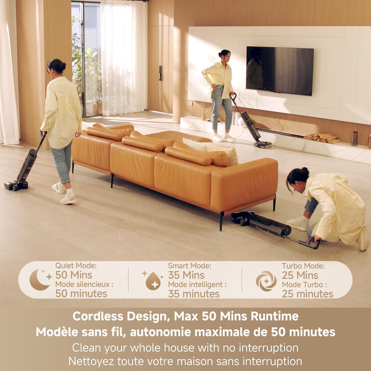 - 50Mins of Long-Lasting Runtime: You can say goodbye to runtime worries and enjoy up to 50 minutes of uninterrupted performance to keep your home spotless. *For proper operation, please install the handle with the self-cleaning button facing toward your body.