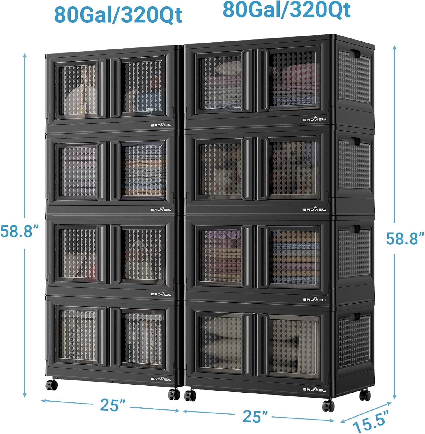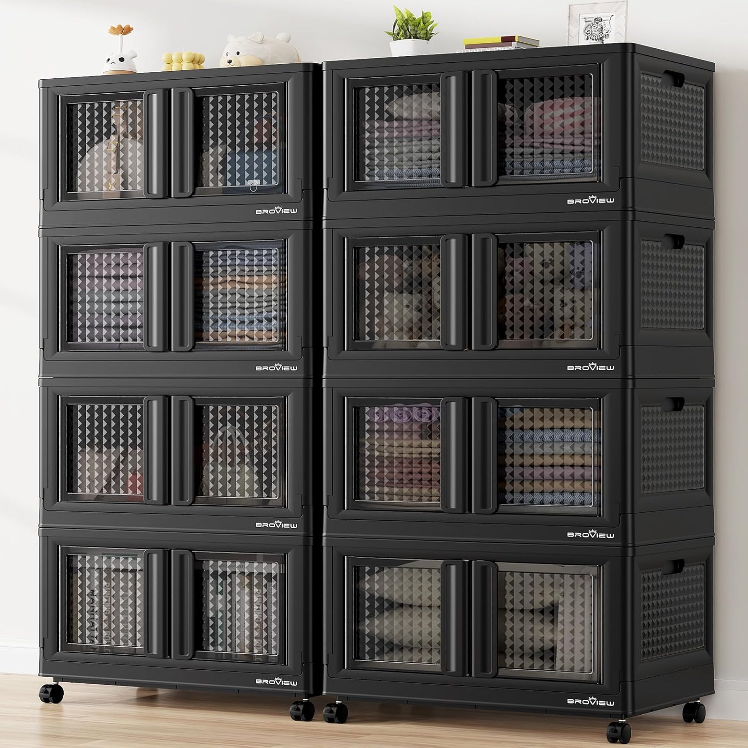 BROVIEW 160Gal Stackable Storage Bins with Lids & Wheels, 640Qt Plastic Collapsible Closet Organizer and Storage Drawers, Storage Boxes Cabinets for Home, Office, 8 Pack, Black