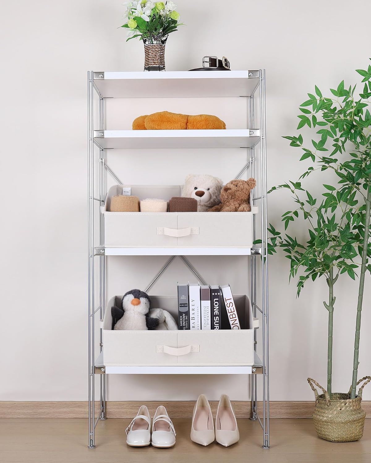 - Large Capacity & Sturdy Build: Measuring 19.5" (L) x 11" (W) x 8" (H/back) / 4.7” (H/front) with a 28L capacity, these closet baskets for shelves are reinforced with cardboard to resist deformation.