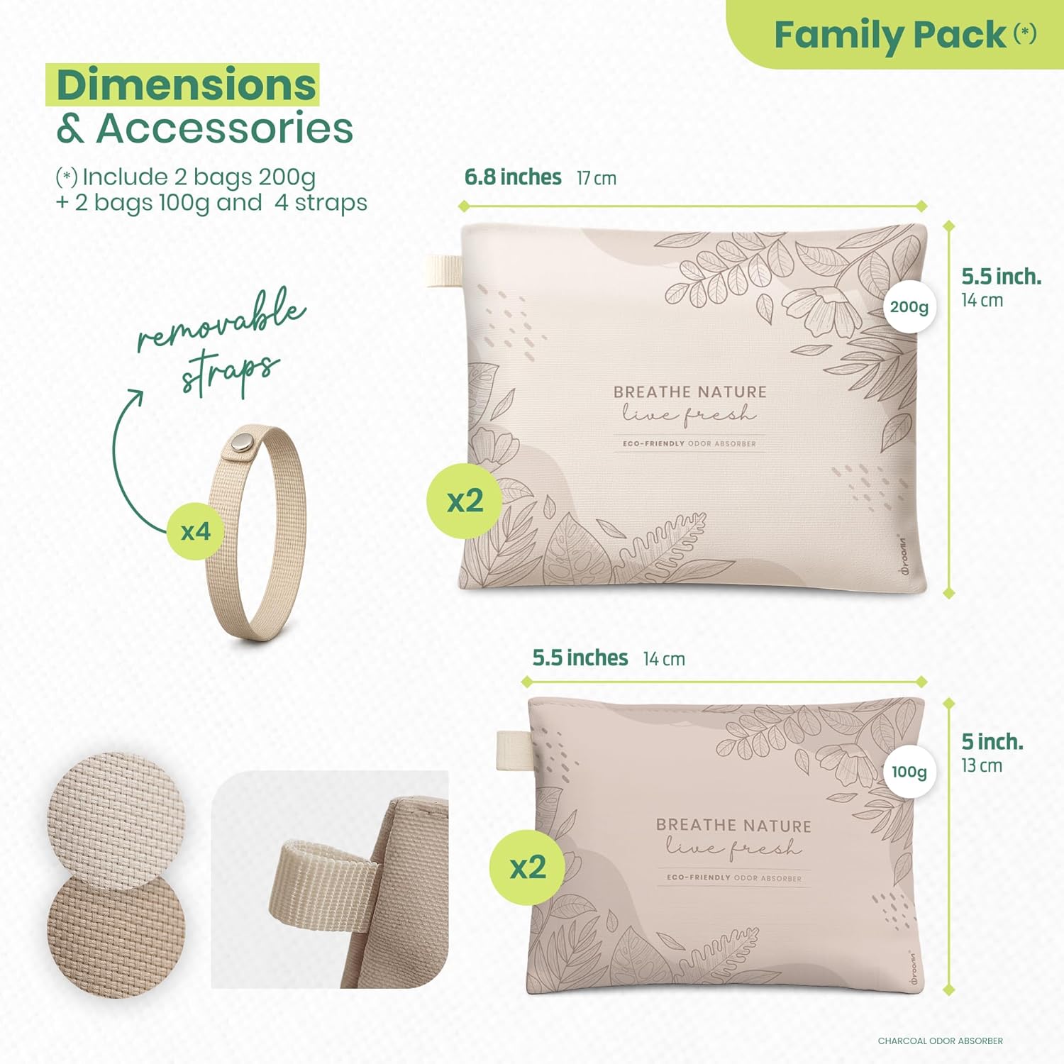 - NATURAL ODOR ABSORPTION TECHNOLOGY: – Harness the power of bamboo charcoal bags to naturally purify your living spaces. This advanced odor absorber targets moisture and bad smells at the source—perfect for closets, cars, bathrooms, shoe racks, cat litter boxes, cabinets, and even the basement.