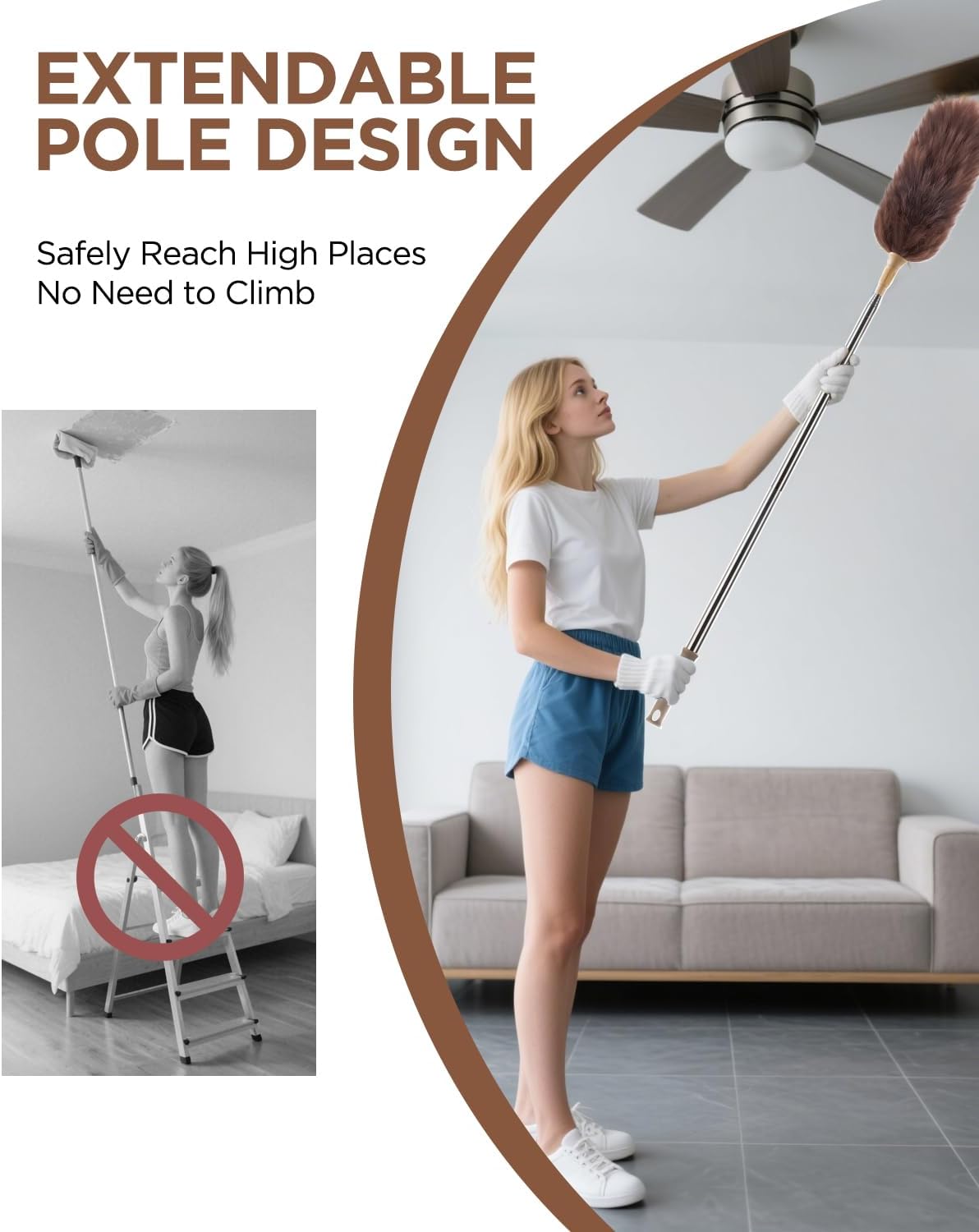 - 【EXTENDABLE POLE】The stainless steel pole extends to 100 inches for easy cleaning of ceilings, shelves, fans, and tight spaces.