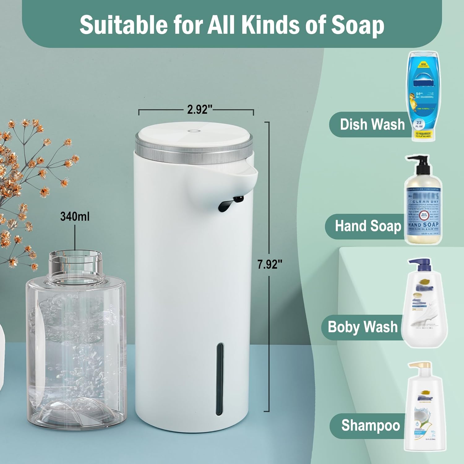 - 【Suitable for a Variety of Soaps】You can directly add liquid soap such as hand soap, dish soap, shampoo, body wash, etc. Please note to not add foaming soap. Equipped with a 340ml large soap container, you don't have to worry about frequently adding soap. Additionally, the machine is designed with a visual window on the outside for you to monitor the soap level at any time and refill it promptly. We believe this automatic liquid soap dispenser is your best choice.