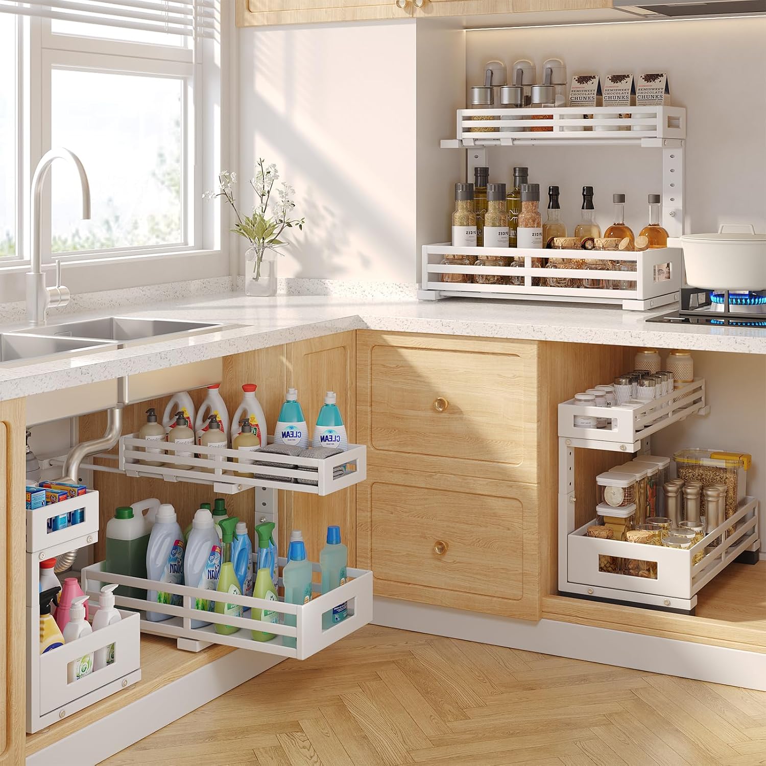 - 【Smart L-Shaped Design 】The innovative L-shaped structure is specially designed to navigate around complicated under-sink obstacles.Whether your cabinet includes a garbage disposal, water filter, or irregular plumbing pipes, this organizer fits snugly without wasting space.Maximize every inch of storage—even in tight, awkward cabinet areas.