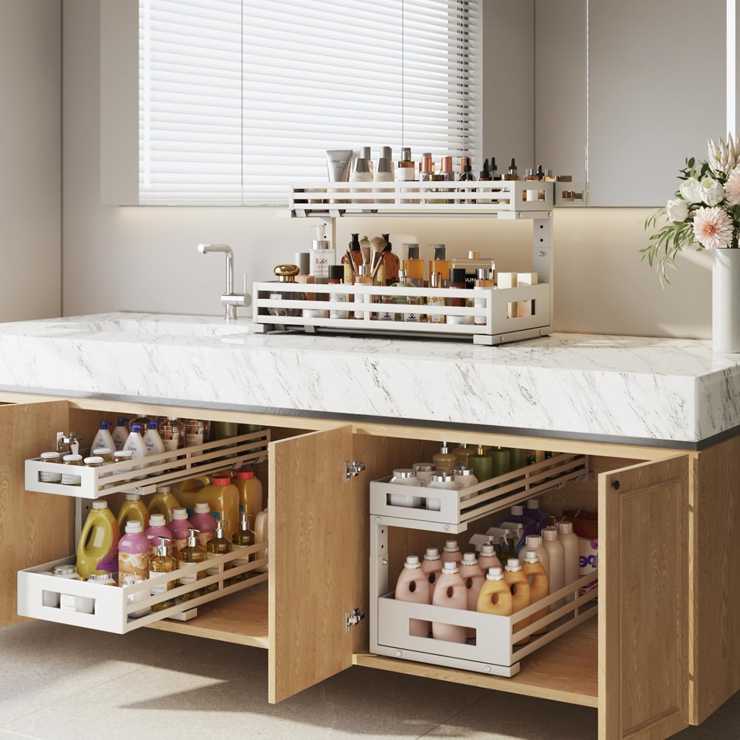 2-Pack 20.47"Deep Under Sink Organizer And Storage,2-Tier L-Shaped Pull Out Cabinet Organizer with Upgraded Slide Rails,Height Adjustable Drawers for Kitchen&Bathroom,Extra-Large Storage Shelves–White