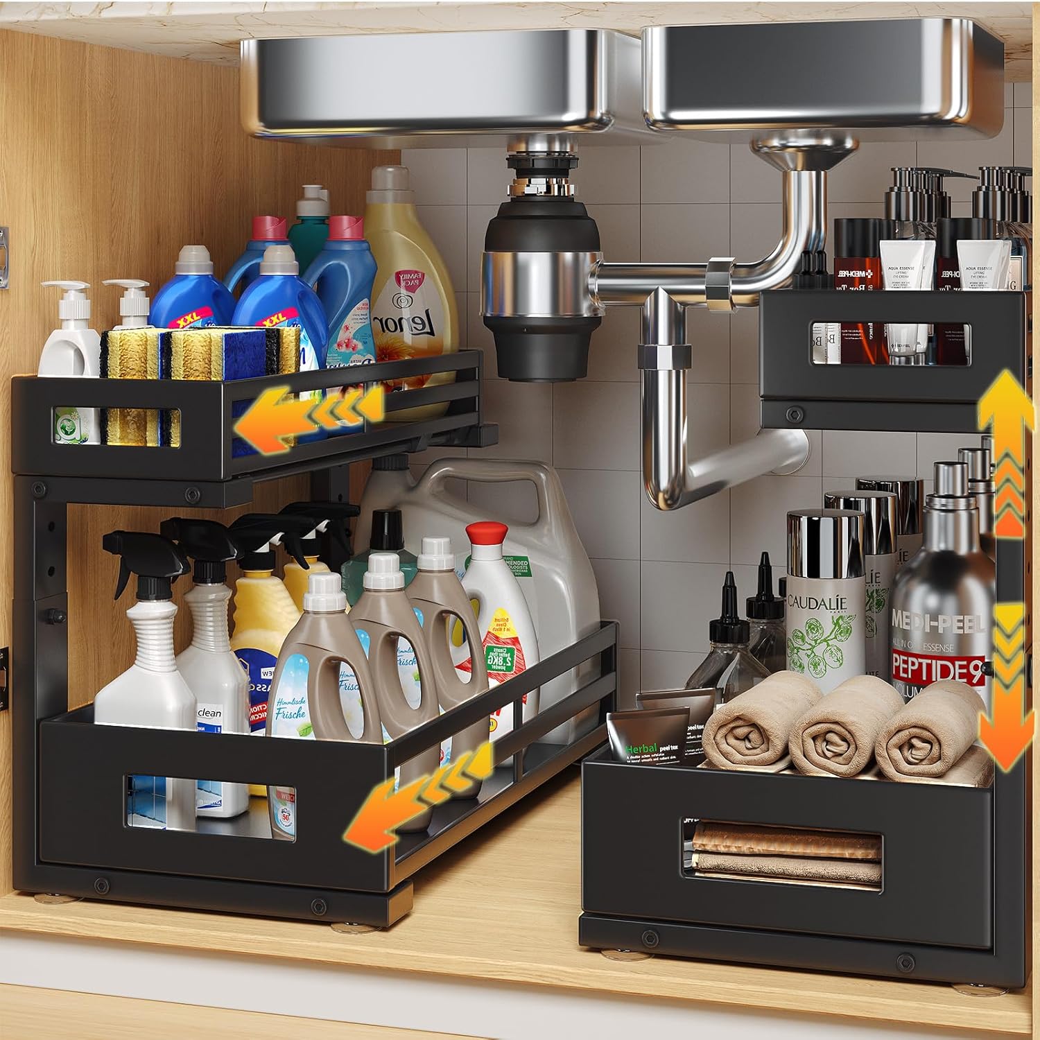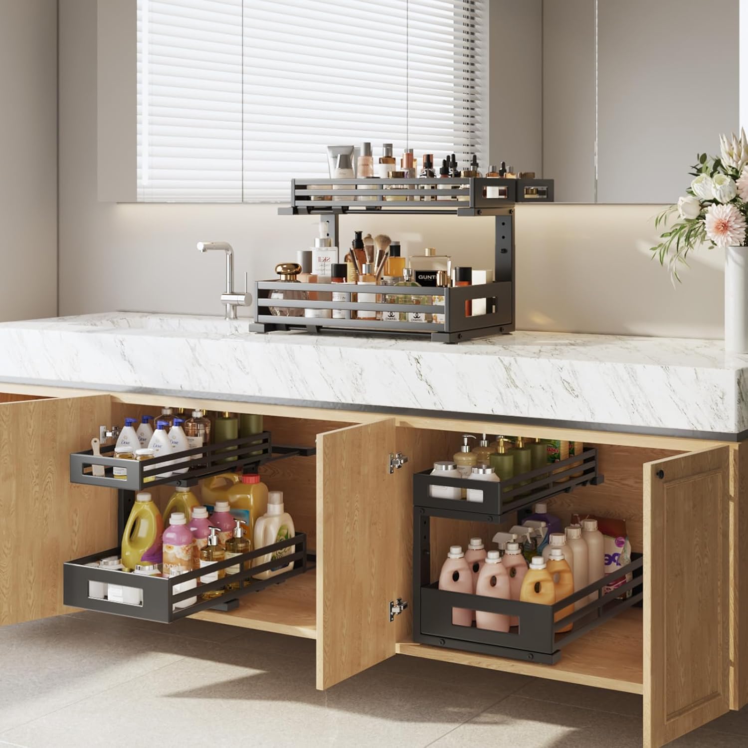 2-Pack 17"Deep Under Sink Organizer And Storage, 2-Tier L-Shaped Pull Out Cabinet Organizer with Upgraded Slide Rails, Height Adjustable Drawers for Kitchen&Bathroom, Extra-Large Storage Shelves–Black
