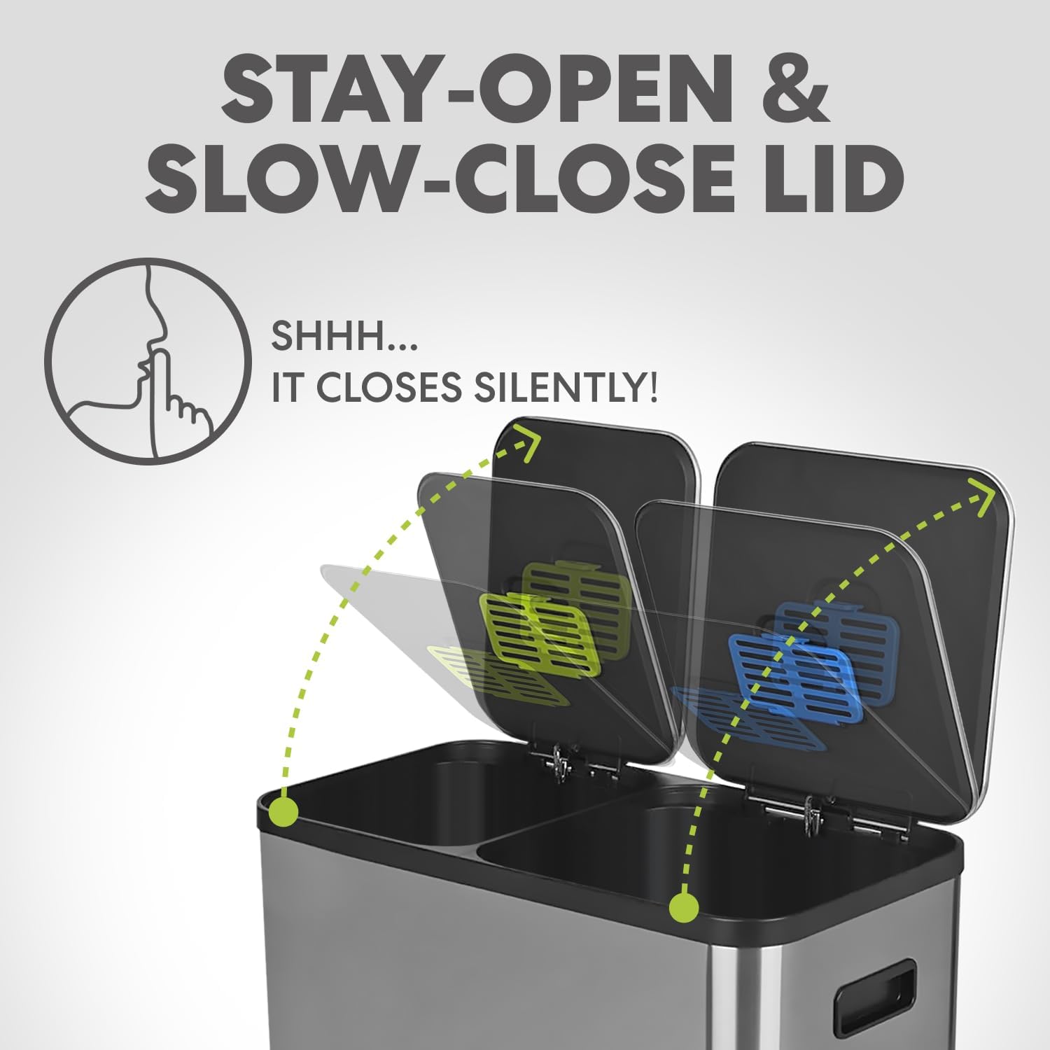 - SLOW CLOSE LID: Quiet, controlled lid closure is designed to reduce unwanted noise and ease down gently.LID LOCK: Extended open lid lock keeps the container open for longer tasks and chores.