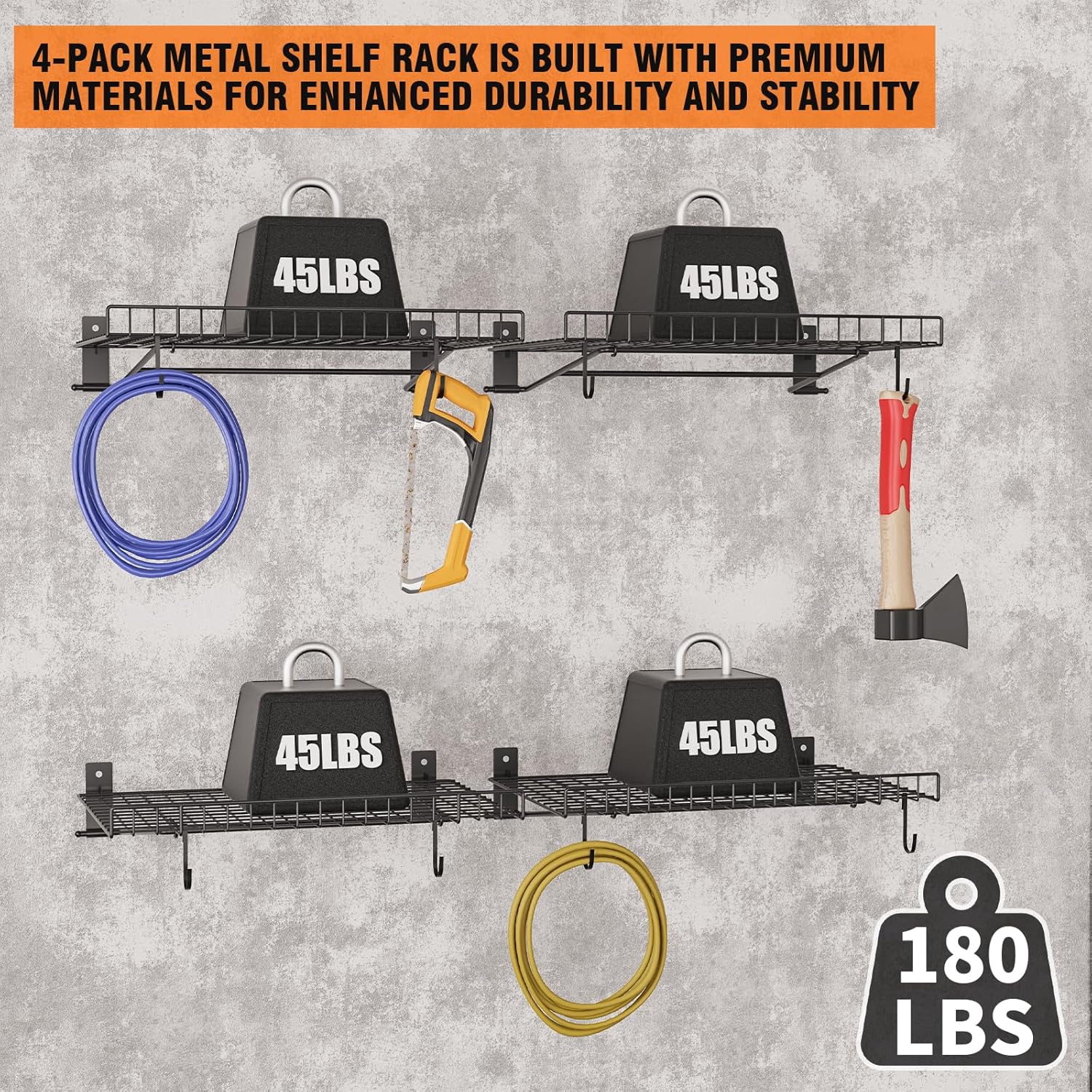 - HEAVY DUTY METAL WALL SHELF: Hanging Garage Shelf is made of high-quality steel with a powder-coated finish for a sturdy structure. After extensive load-bearing testing, each metal rack has a load-bearing capacity of 45 pounds, and 4 metal racks have a load-bearing capacity of 180 pounds, providing a sturdy and secure storage solution for your valuables.