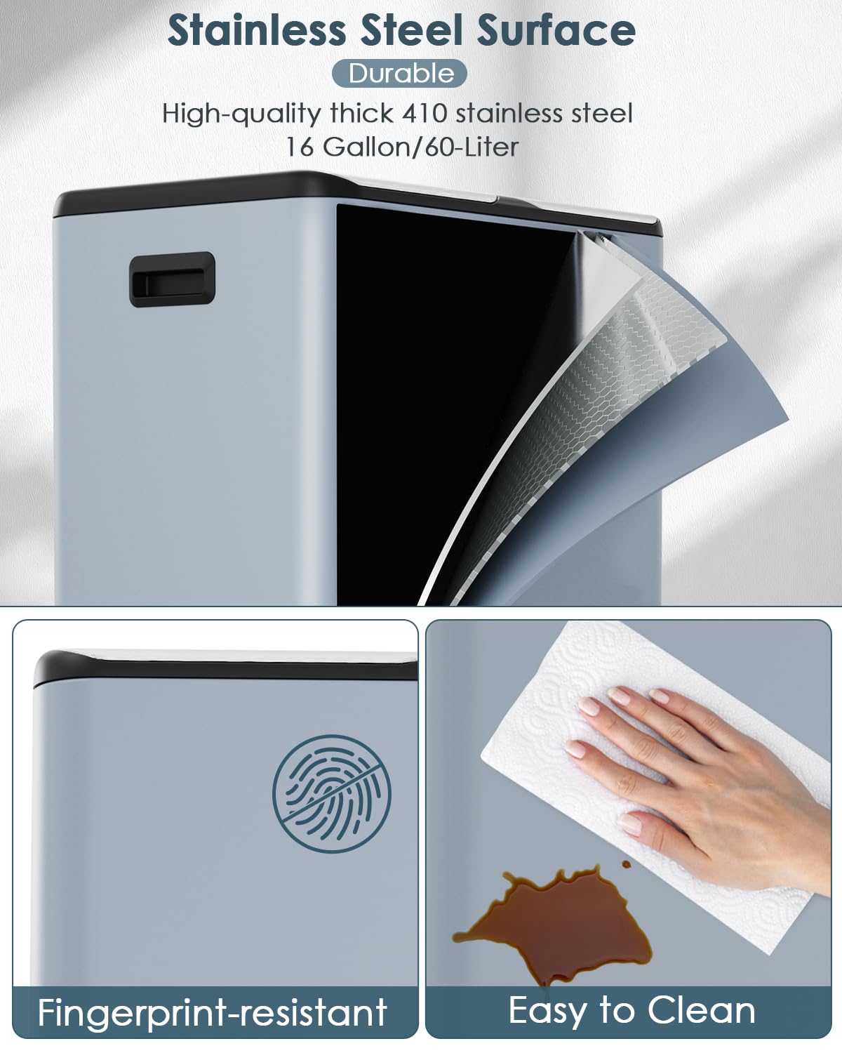 Arlopu 16Gal Dual Trash Can w/2 Built-in Box for Odor Control, Hands-Free Kitchen Garbage Bin, Recycle Waste Dustbin, Soft-Close Lid, 2 Buckets,Foot Pedal, Side Handle, Airtight,for Home Office