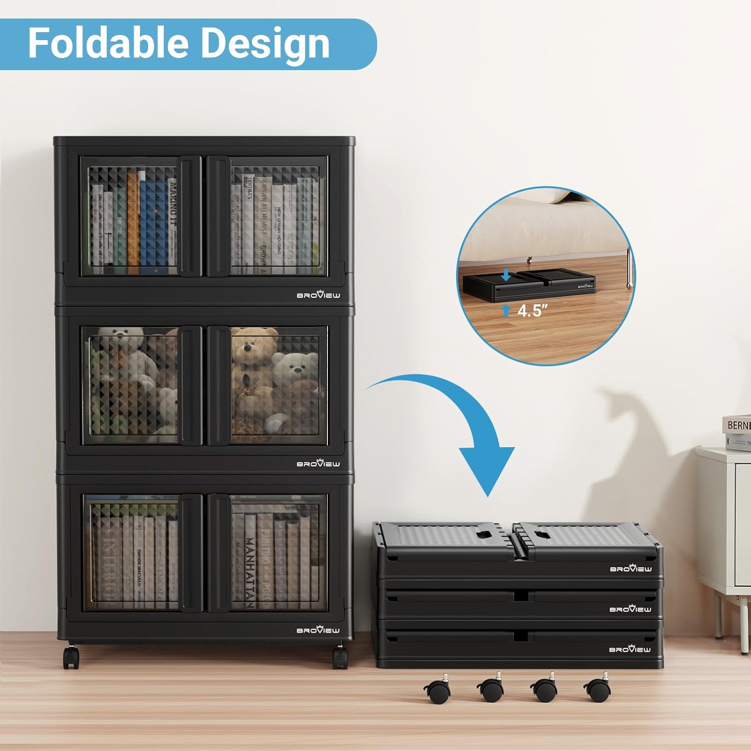 - 【Stackable and Foldable Design】 You can stack different numbers of plastic storage bins you want, such as bedside cabinets, clothes cabinets, bookcases, kitchen cabinets, etc. With roomy capacity, odorless, and foldable design, these storage containers are perfect for your closet organizer, laundry organizer, trunk organizer, garage tote, playroom storage, book storage shelves, classroom bins, and dorm storage box.