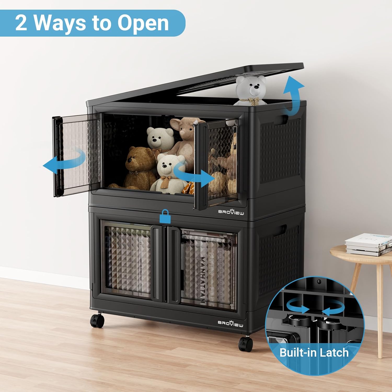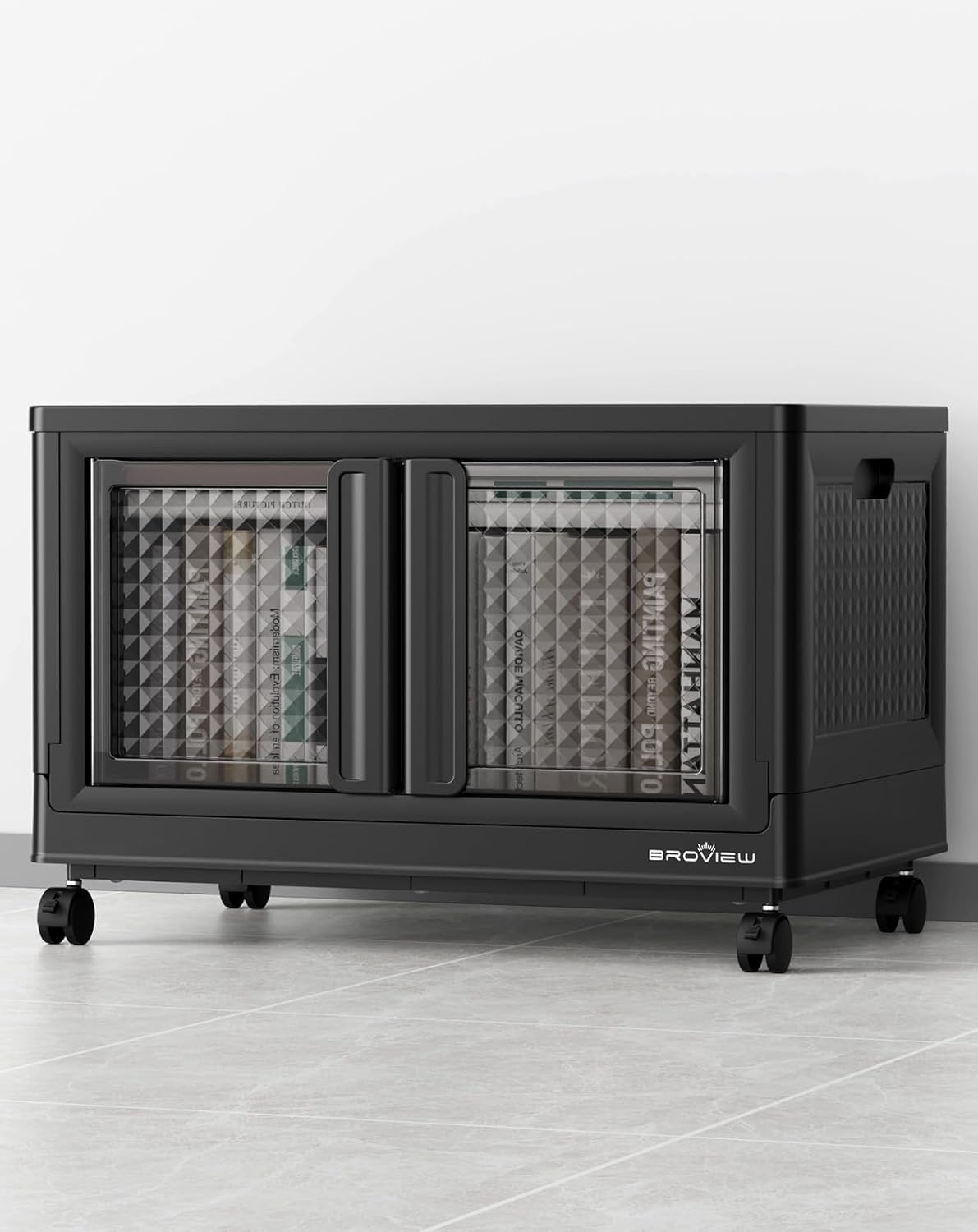 BROVIEW 100 Qt Stackable Storage Bin with Lid & Doors, 1 Pack Plastic Closet Organizer and Storage Drawer with Wheels, Large Collapsible Storage Box, Cabinet for Home, Office, V10, Black