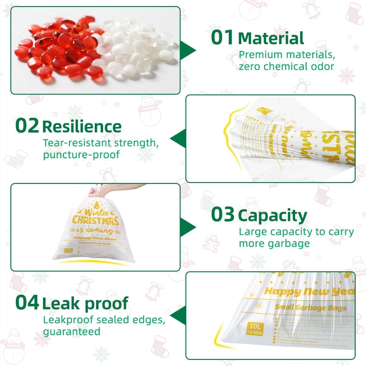 - 🎄 Perfect Capacity & Count:Convenient 3 gallon size fits small trash cans, with 50 bags per pack to last through the holiday season and beyond—ideal for kitchen, bathroom, or office use.
