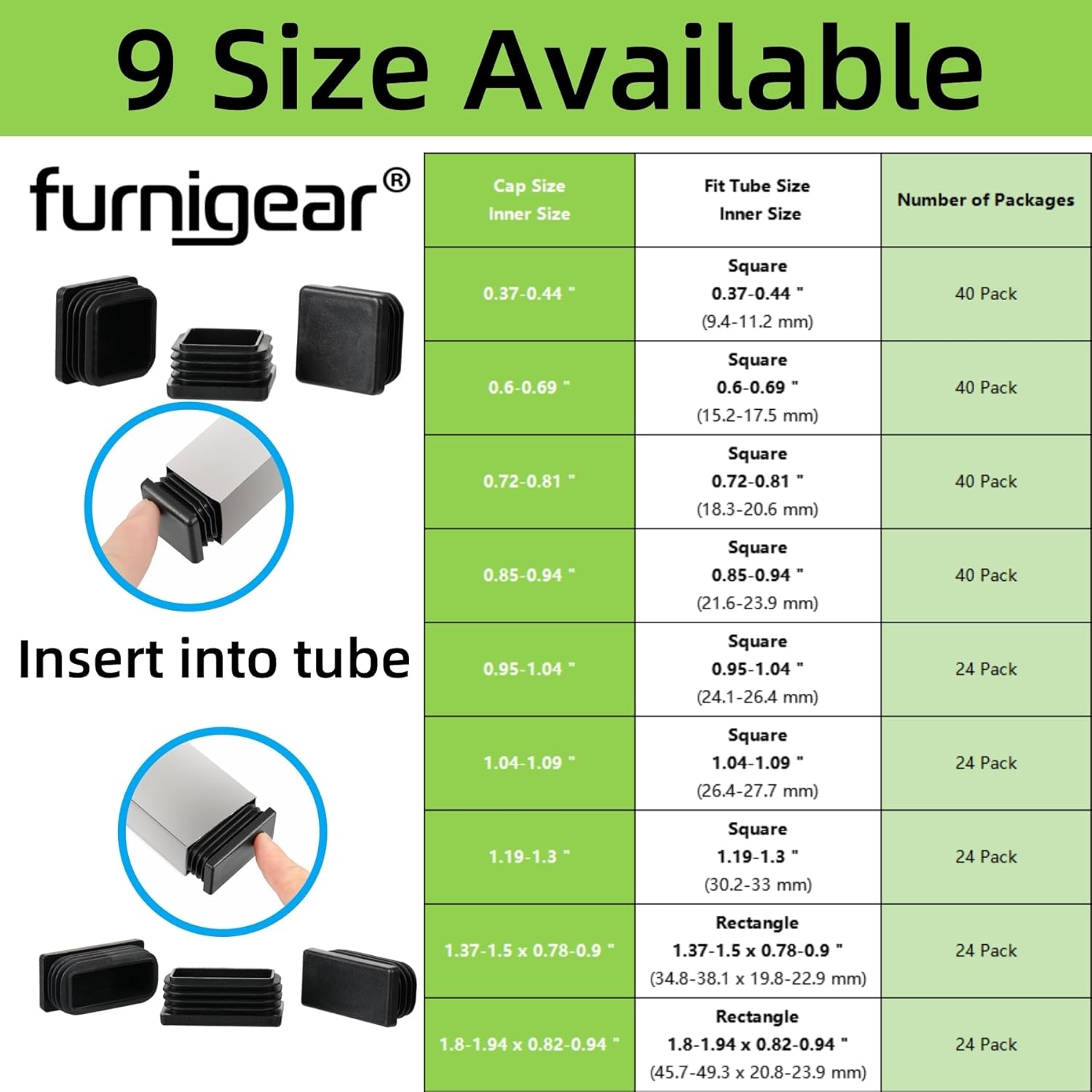 Furnigear Plastic Plugs Tubing End Cap Chair End Caps Outside Bottom Tubing Caps Square Furniture Sliders Glides Black (24, Fit 1.04-1.09" Square Tube Inner Size)